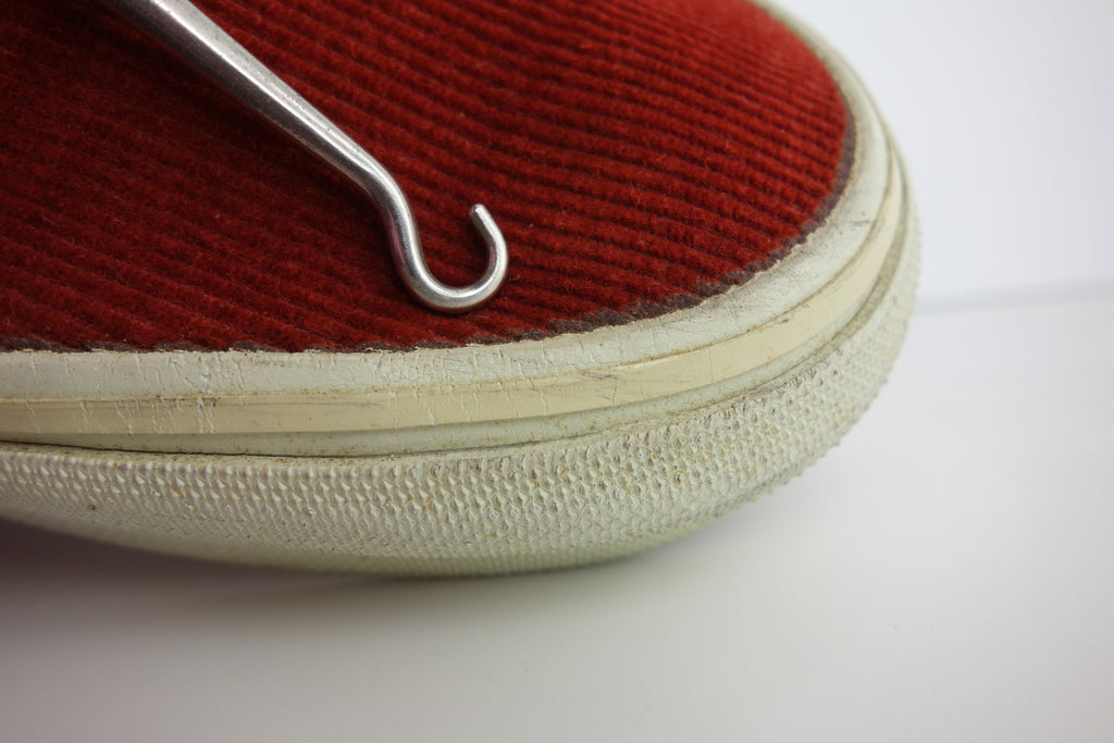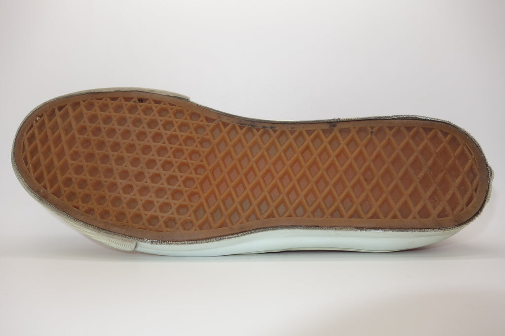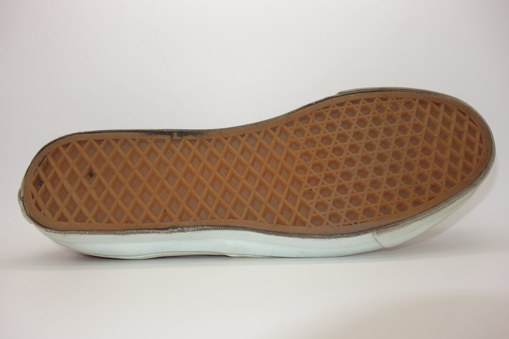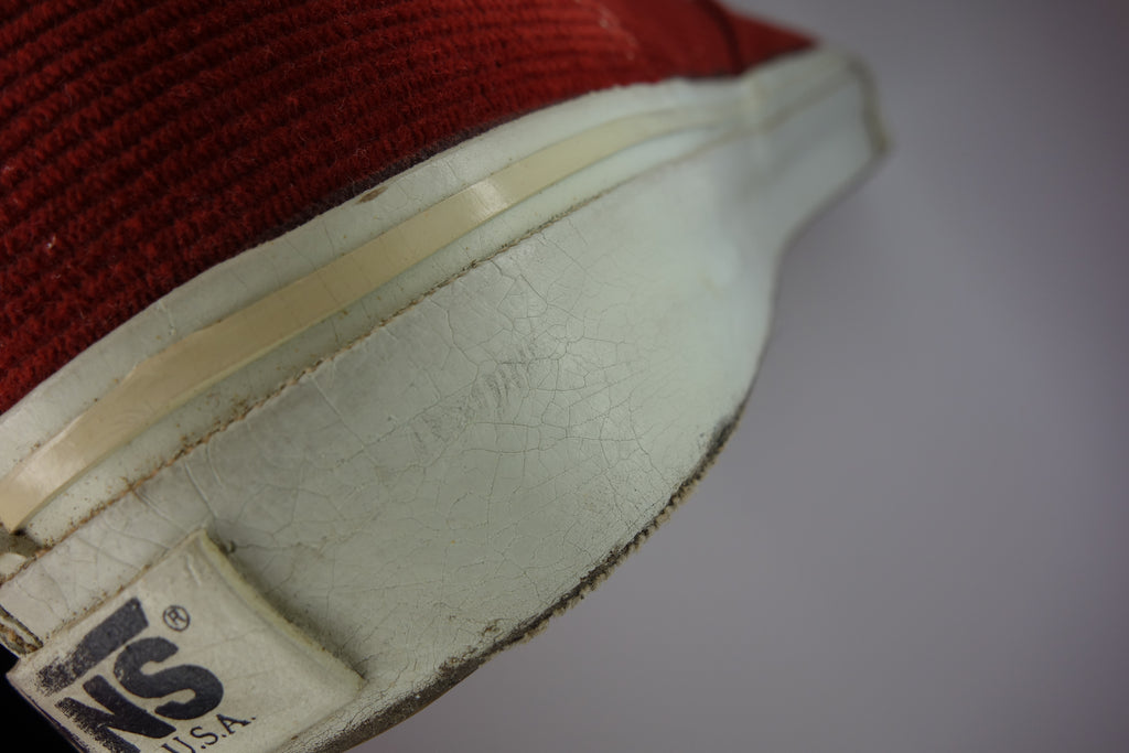 very good used condition. the white rubber first foxing has perished however & shows widespread yellowing & curing/solidification. i forsee further separation from uppers & widespread chipping/cracking, especially at bends & a trail of rubber. the midsole friction & waffle are unaffected & will hold up. box is old & included, but not true to era or shoes. wear at own risk
