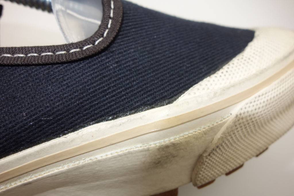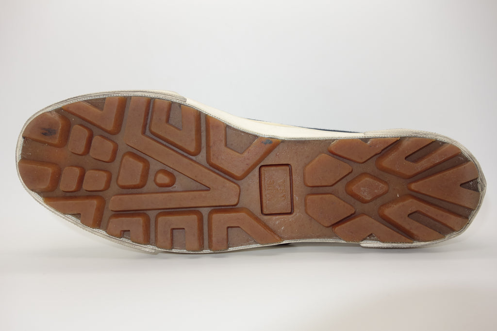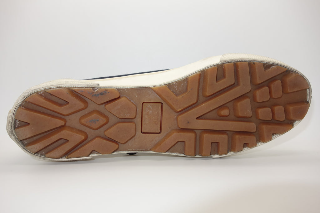 sadly the ecru rubber has perished & shows intermittent curing/solidification to the foxing stripe area. cracking will occur upon bends & chunks of rubber will be lost. thereafter they will hold up to normal wear however with gauges eroding into the first foxing. the outsole & friction itself is unaffected.