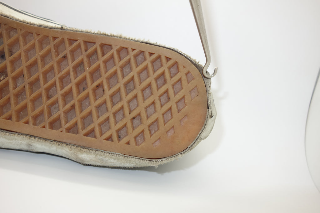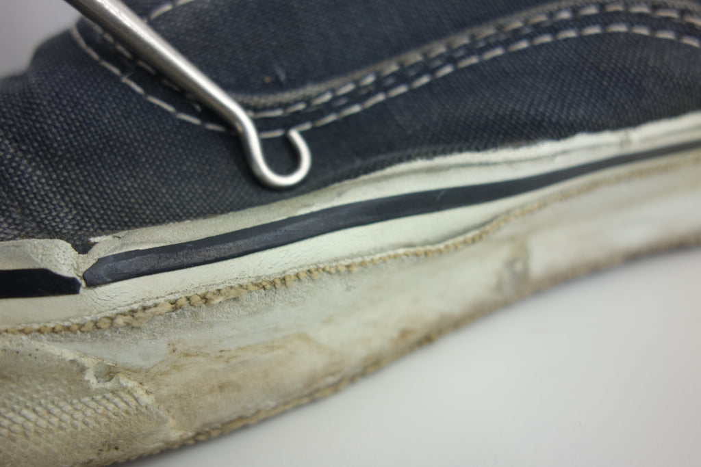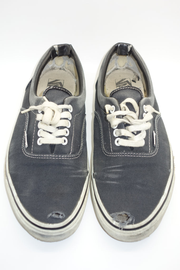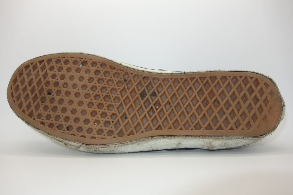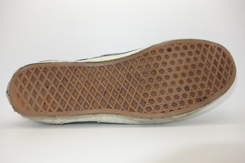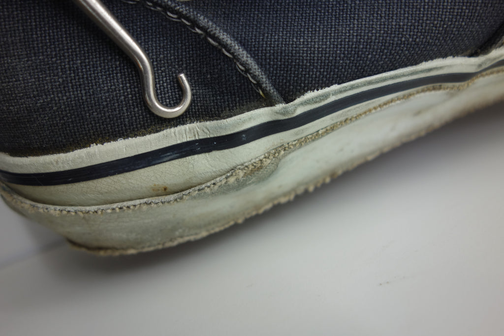 well worn & uppers show holes at big toes but structurally sound & still life left. all rubber remains soft & flexible apart from dryness towards the heels. wear to internal heel lining but plastic counter is intact. waffle & insole are sound. vinyl collar show splitting & lifting