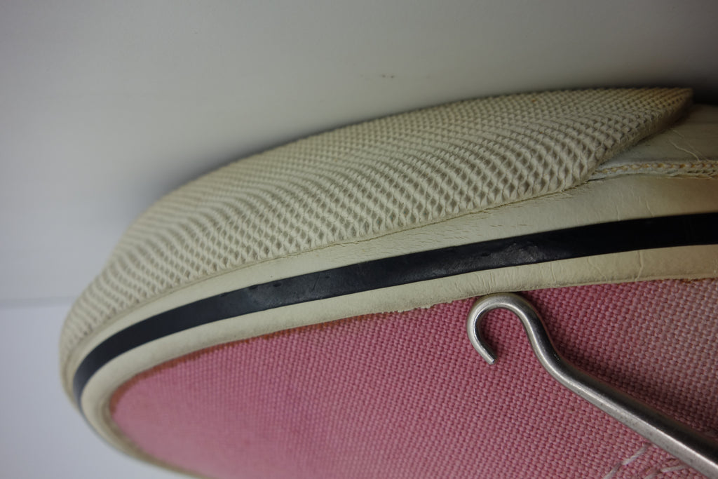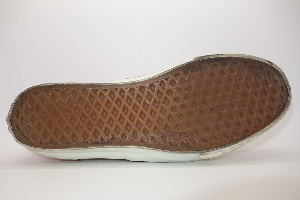 barely worn however the right shoe saw extended exposure to the elements as a floor display model. the resulting canvas fade & rubber yellowing may effect longevity however from experience early examples like this merely flake away the top surface of rubber without damage at depth. the jigsaw cracking to the friction should again not imapir normal wear so much however these could go either way. wear at own risk