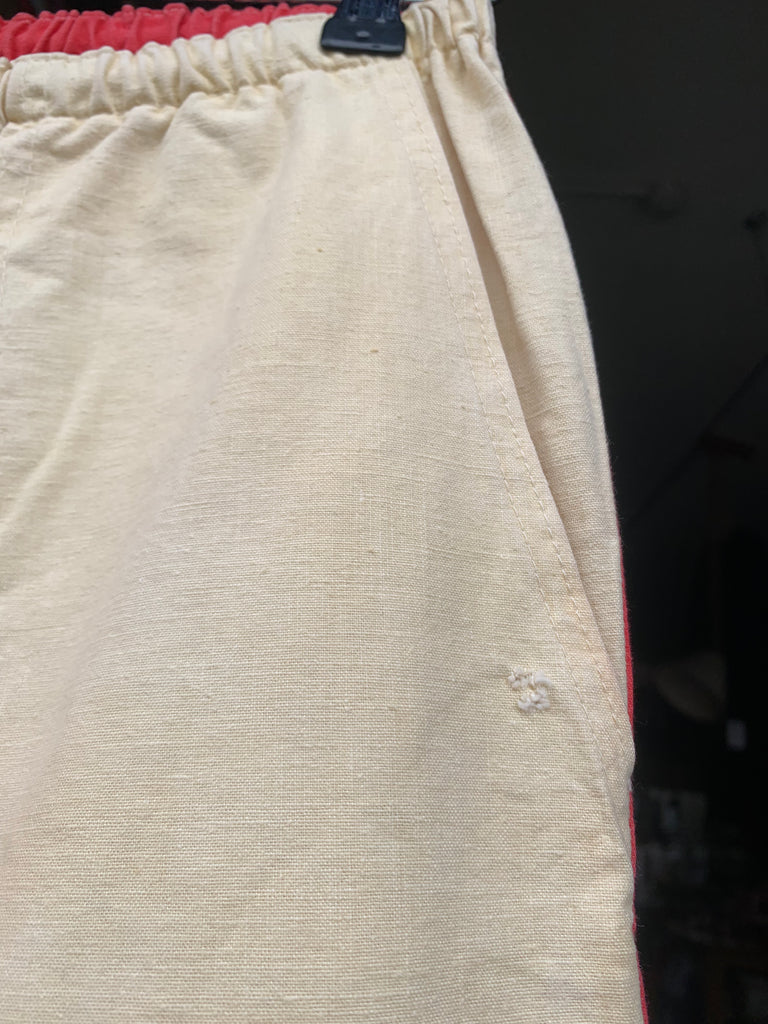 excellent used condition. all elastic still stretchy & includes original drawstring. a few pinhole blemish & small smudge to cream panel.