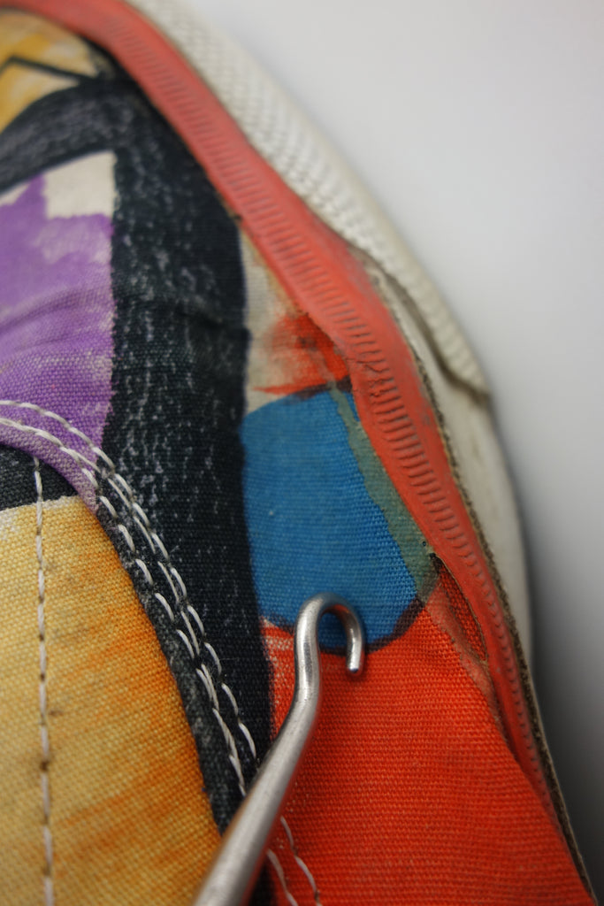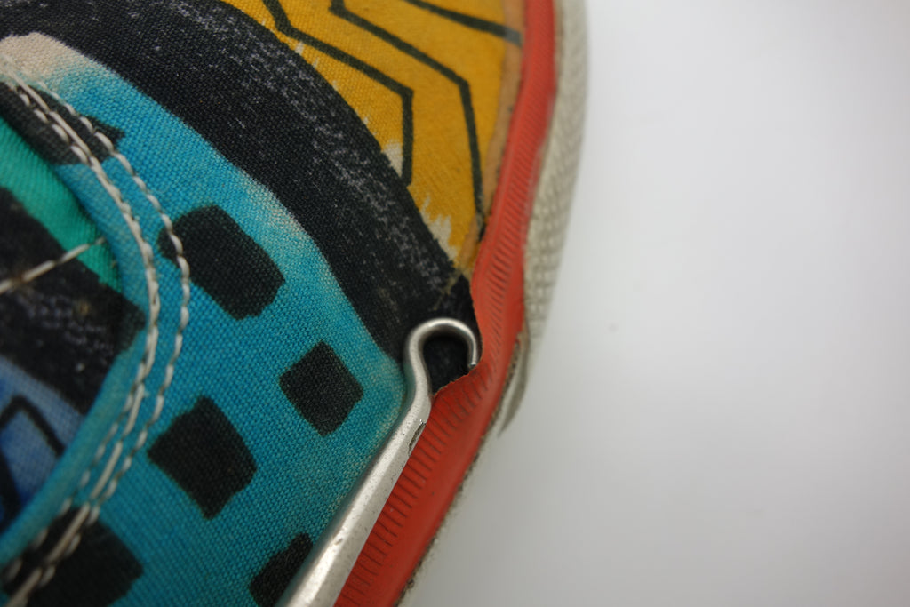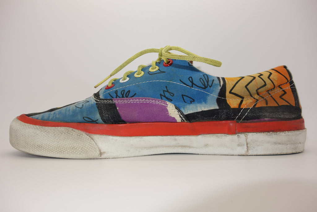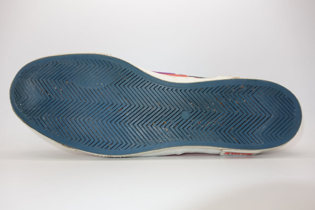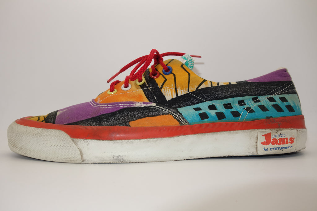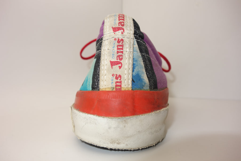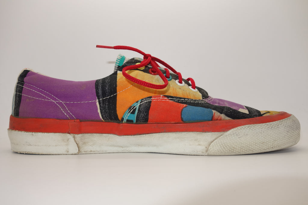 good used condition. all rubber remains soft & flexible with minimal separation from uppers. fiber-fill foam padded collar does perish over time leavy dry dusty natural residue inside shoes. these were worn bare foot & do host an unpleasant odour! im confident with appropriate product this can be removed. 1 sets of coloured laces included. listed as US9.5, jams fit big like US10 in original vans. check measures!