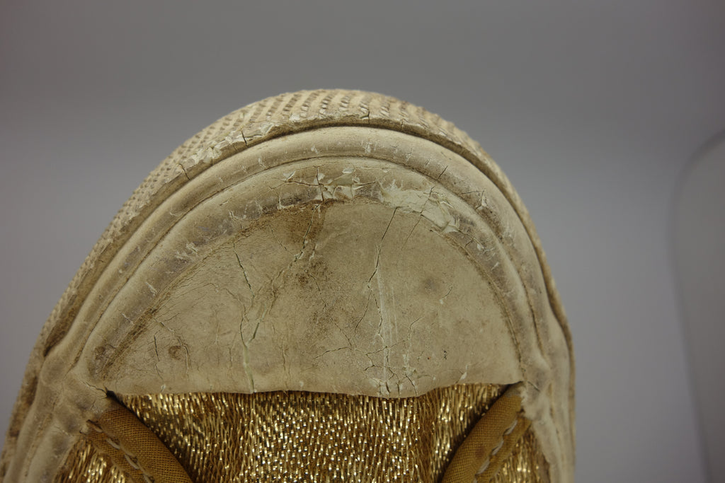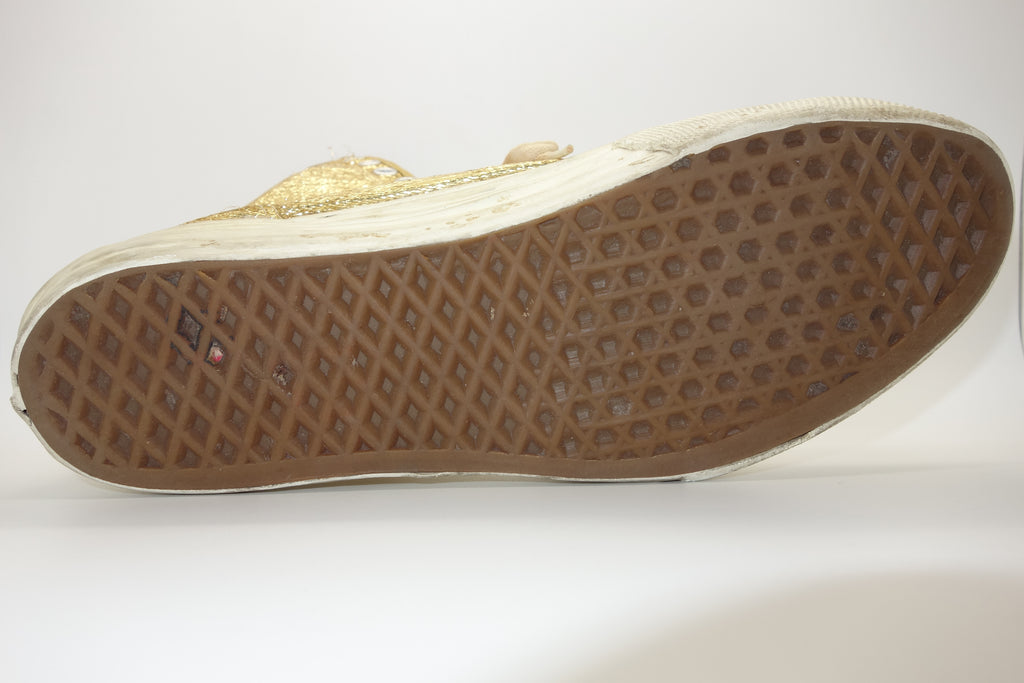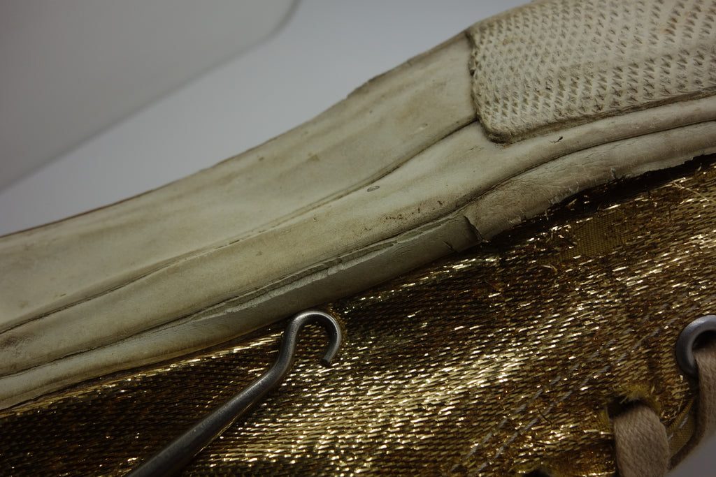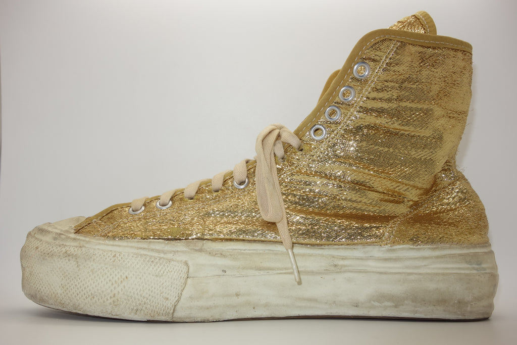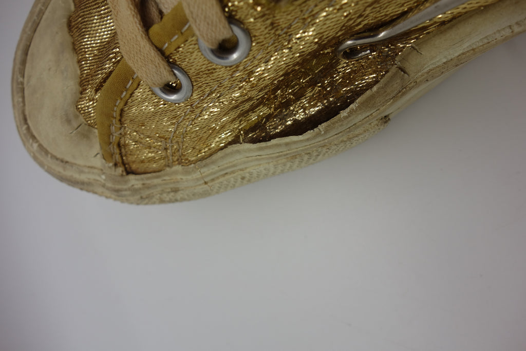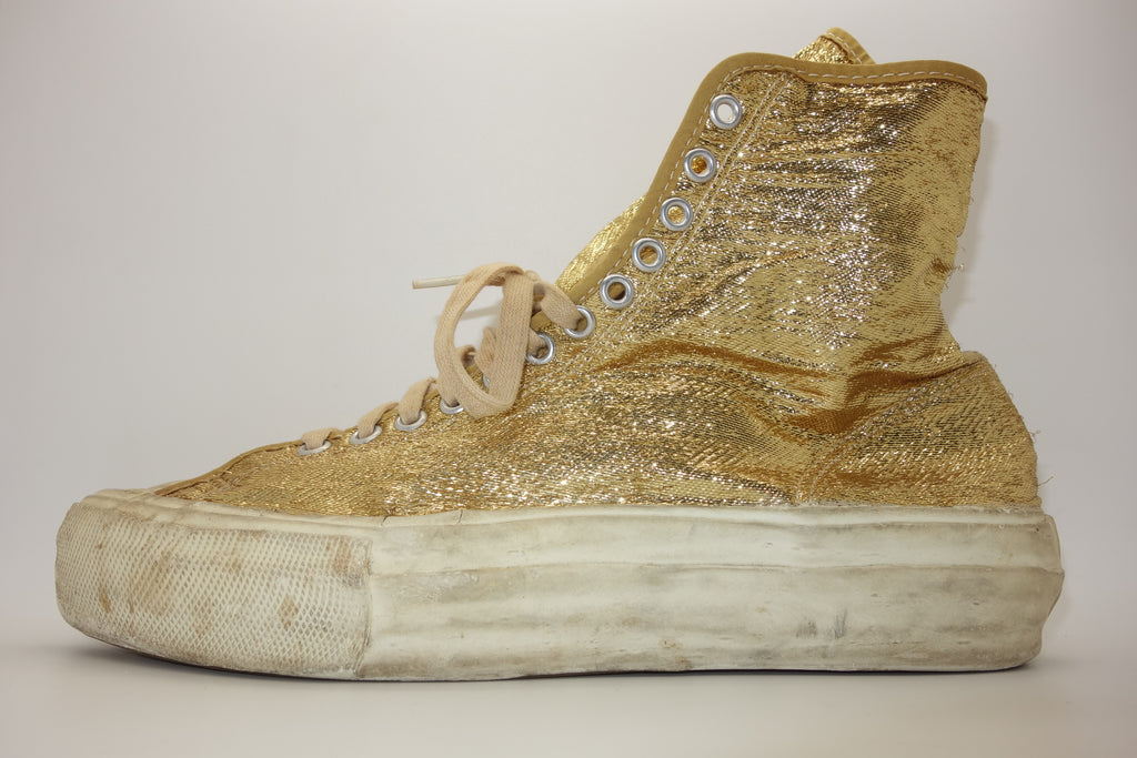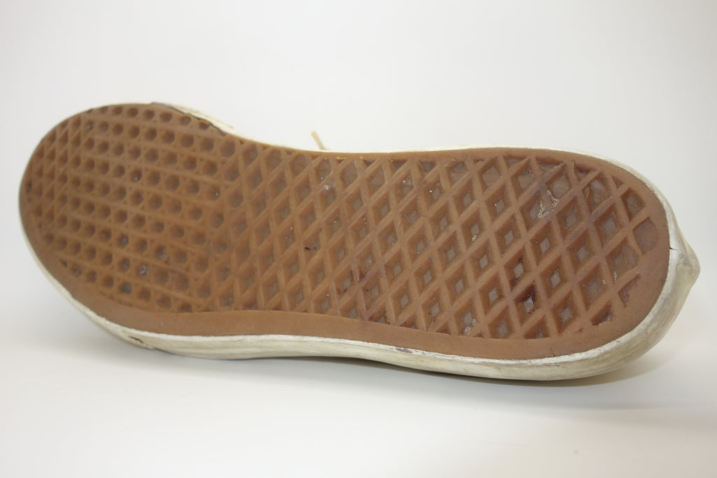 very good used condition. these are bespoke provide-your-own customs. sadly the rubber has perished in part over the years. the top layer of first foxing shows widespread curing/solidification, as does the second foxing, which are likely to crack upon bends. this material did not bond so well with the rubber & widespread separation from uppers has occurred & may continue. the bumper & toe caps are also brittle in part. the waffle & friction itself are unaffected however. the internal heel counter has stiffened but is intact. size 10 is written in biro inside the collar & im confident this is accurate. from experience these can be worn however they are likely to crack upon bends with unsightly loss of rubber chunks but thereafter will hold up to wear. wear at own risk!