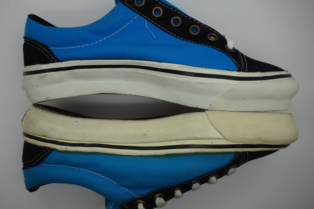 the right shoe was used short term as floor display model with resulting minor canvas fade, rubber & overglue discolouration. all rubber remains soft & flexible & this should not effect wear or longevity.