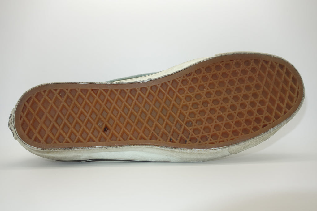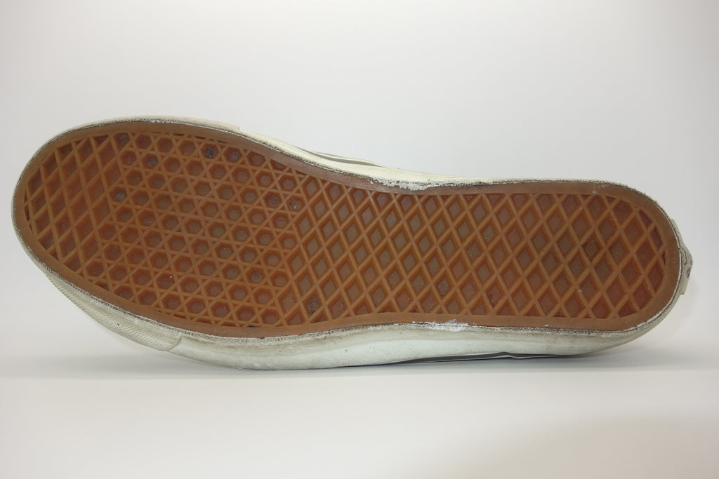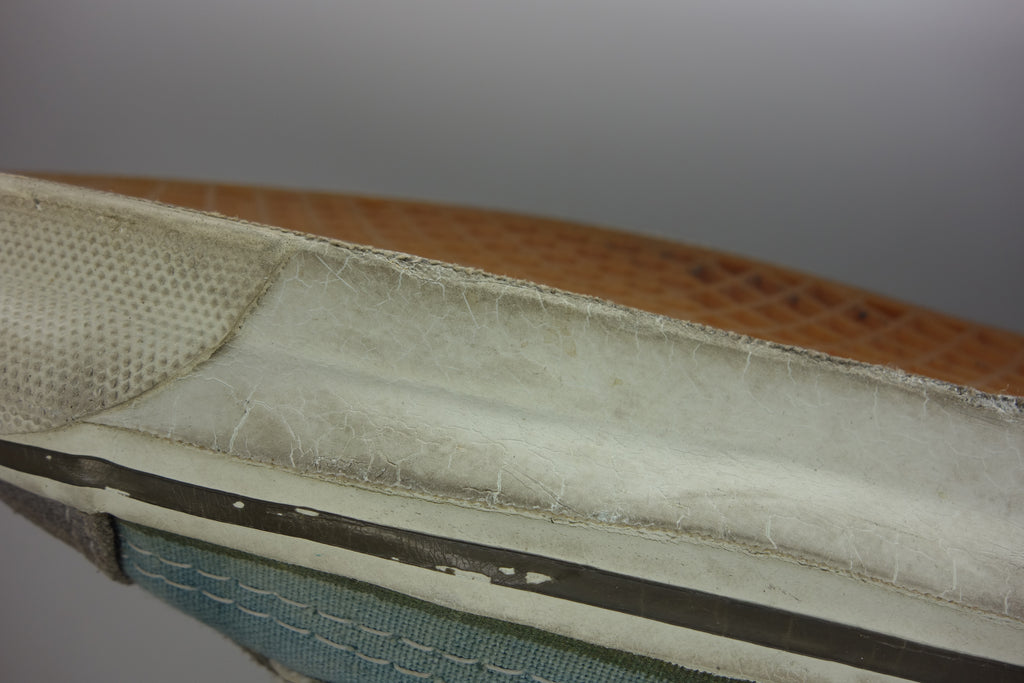 excellent used condition however the rubber has partially perished. damage is not widespread but the medial side of both shoes has solidified & is slightly brittle. only the first foxing is effected on those sides, whereby the foxing stripe area will crack & flake away. the friction, bumper & waffle itself are unaffected. these will hold up to normal wear however there will be loss of rubber in those areas. wear at own risk. laces not original