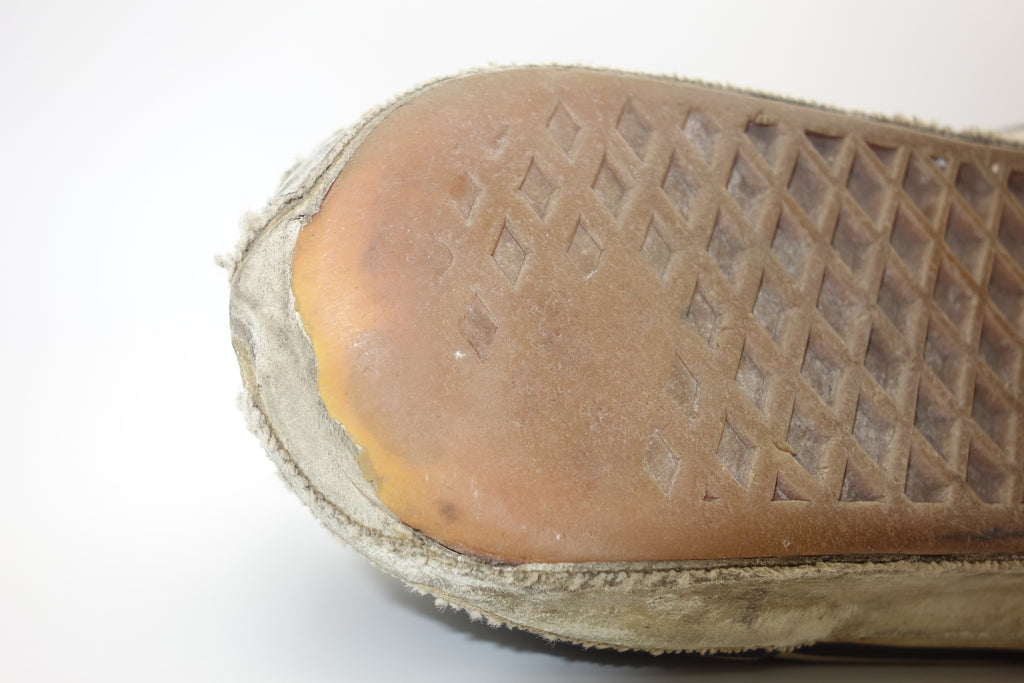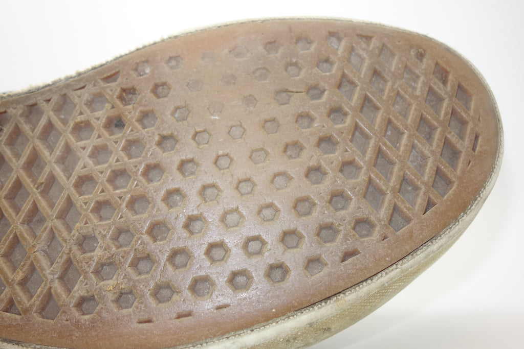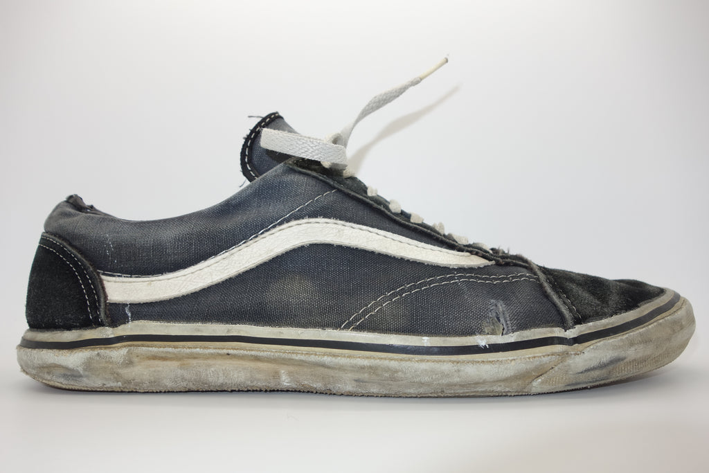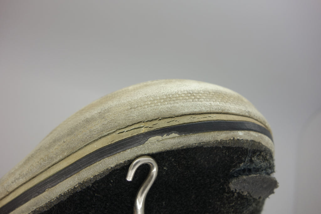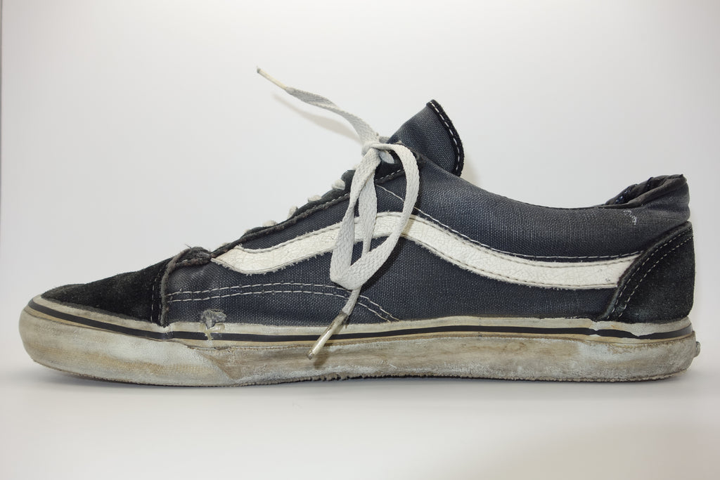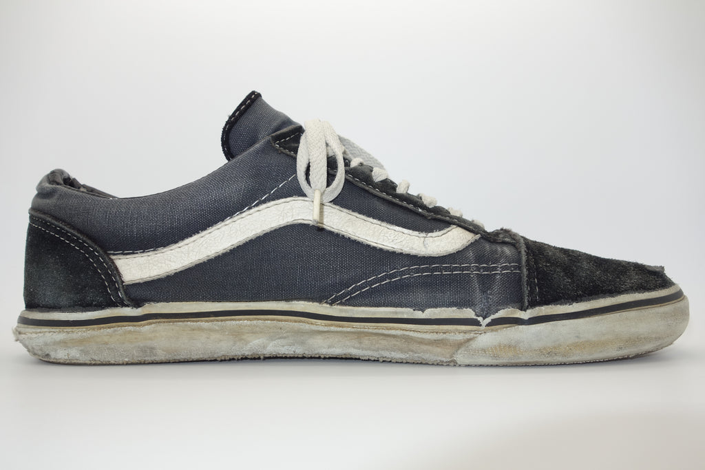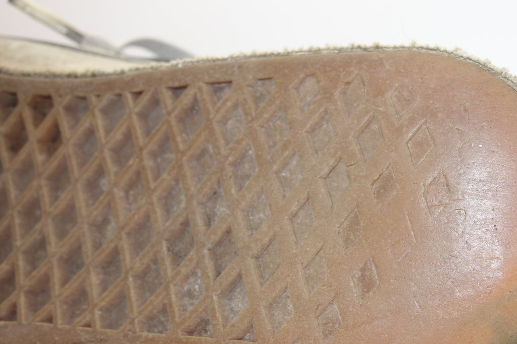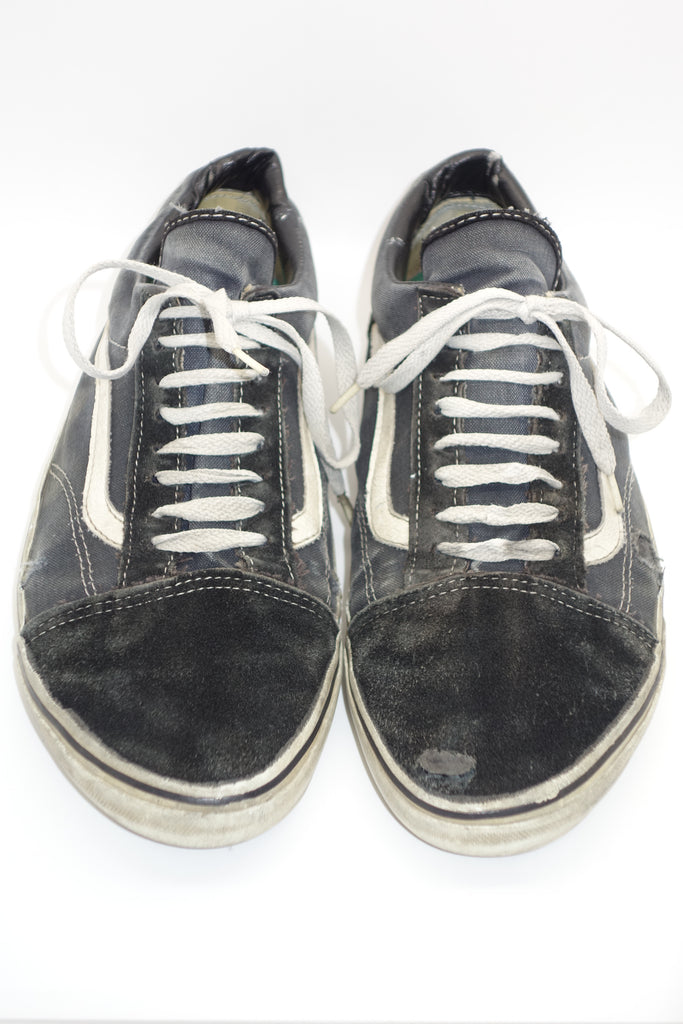 skated & well-word but were well-loved. rubber remains soft & flexible with some separation from uppers only & widespread stress cracking throughout. the waffle is a bit crusty but not slick. the padded tongue of mid-late 90s vans is prone to deterioration. the foam is mint however may be prone to breakdown over time which may leave black residue inside the shoe & turn socks black. some splitting to vinyl collar. ollie hole & hole at left toe repaired with shoo-goo however repair work has been undone by continued wear. wear to lining of internal heel counter however it remains intact. cushioned heels have been added on top of the original insole however only reaches to the arch of shoe. bought as US11.5 however size not visible & possibly are US11