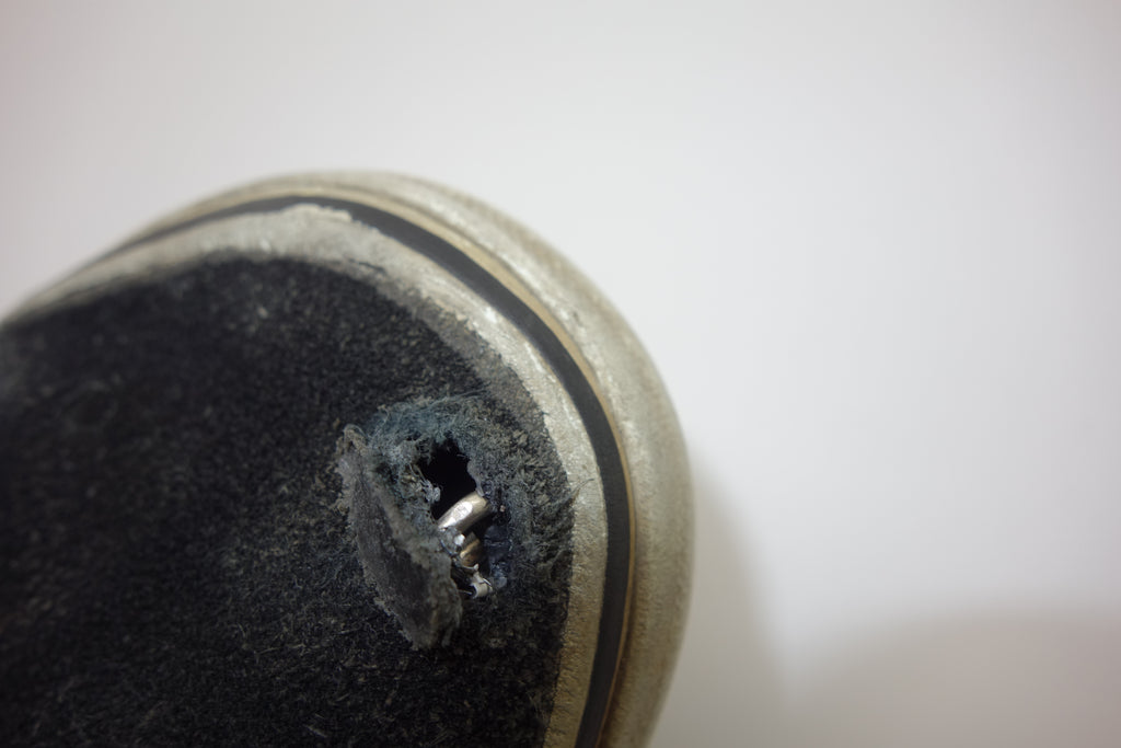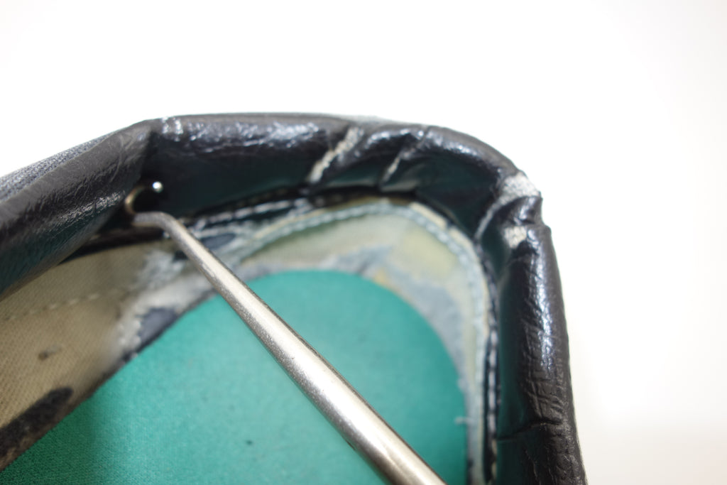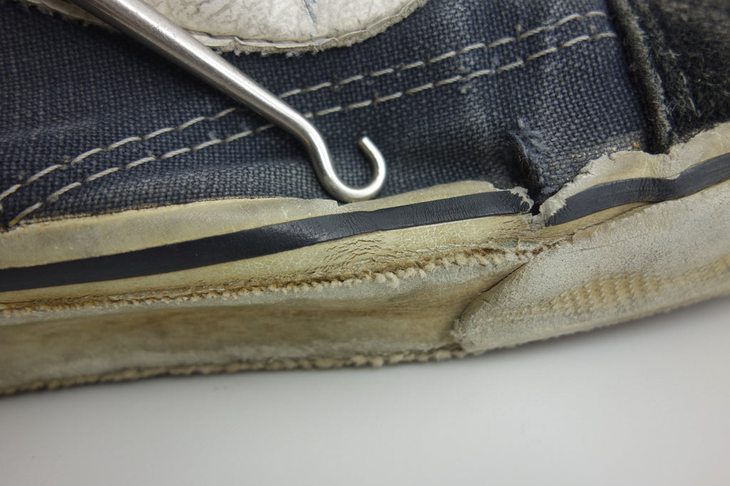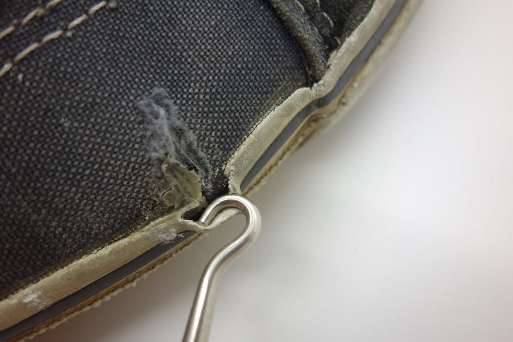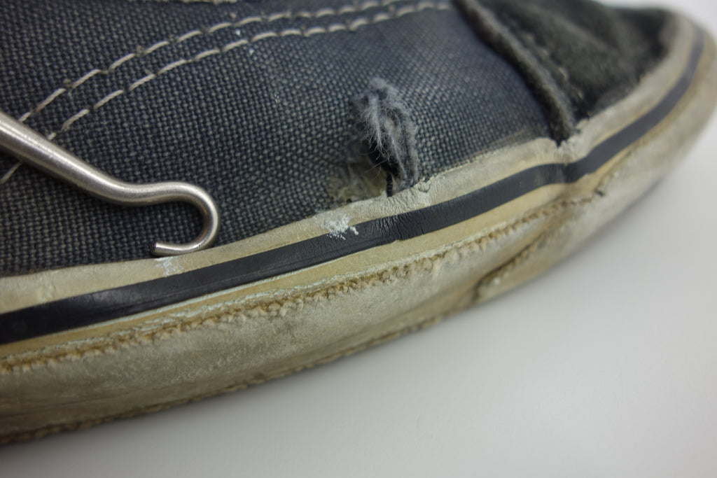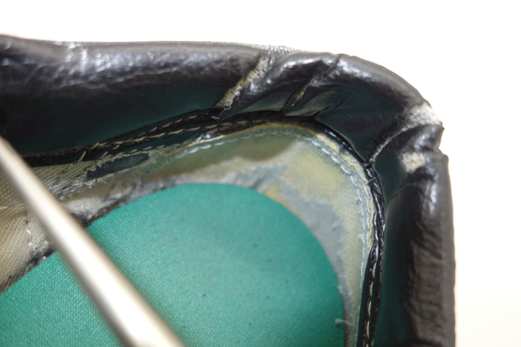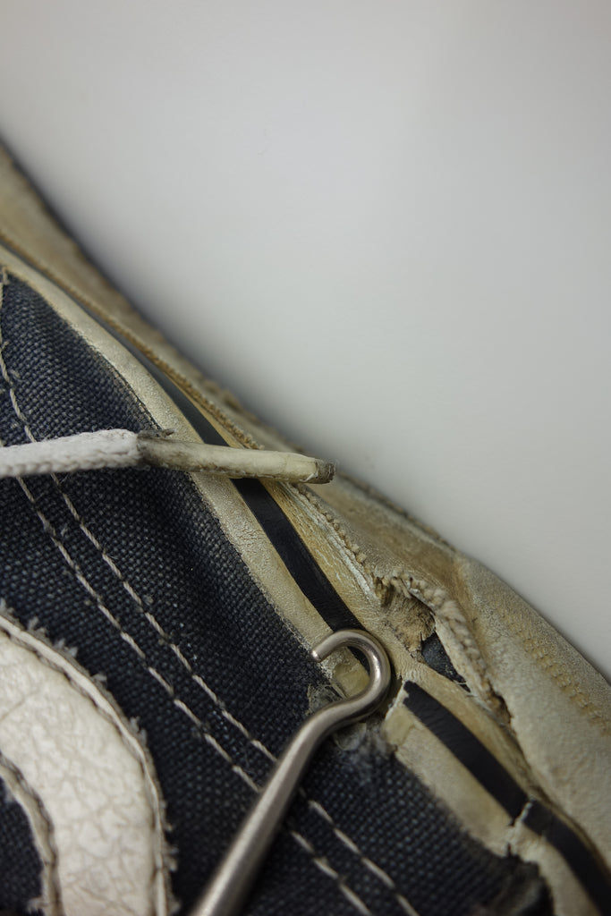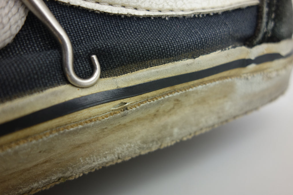 skated & well-word but were well-loved. rubber remains soft & flexible with some separation from uppers only & widespread stress cracking throughout. the waffle is a bit crusty but not slick. the padded tongue of mid-late 90s vans is prone to deterioration. the foam is mint however may be prone to breakdown over time which may leave black residue inside the shoe & turn socks black. some splitting to vinyl collar. ollie hole & hole at left toe repaired with shoo-goo however repair work has been undone by continued wear. wear to lining of internal heel counter however it remains intact. cushioned heels have been added on top of the original insole however only reaches to the arch of shoe. bought as US11.5 however size not visible & possibly are US11