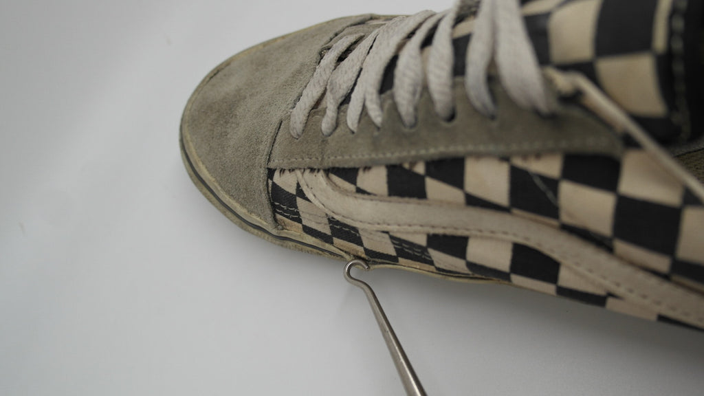grey suede, black/white check print canvas