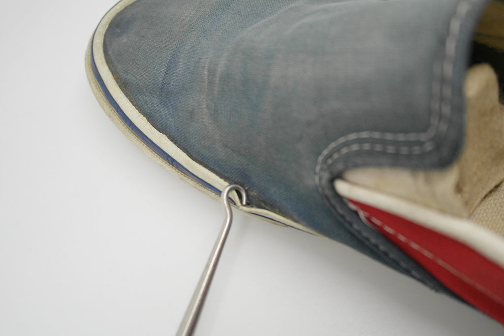 shoes have seen significant wear with canvas fade however remain structurally sound. the rubber midsole is dry & somewhat crusty but not hard. minimal separation between rubber & uppers at toe crease & seams should not worsen. vans were worn bare foot with wear to inner lining at toes & through internal toe cap to canvas. shape is slightly blown out indicating perhaps a head with US10-13 feet maybe squeezed inside? size not visible but im confident theya re US9