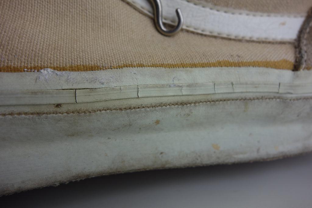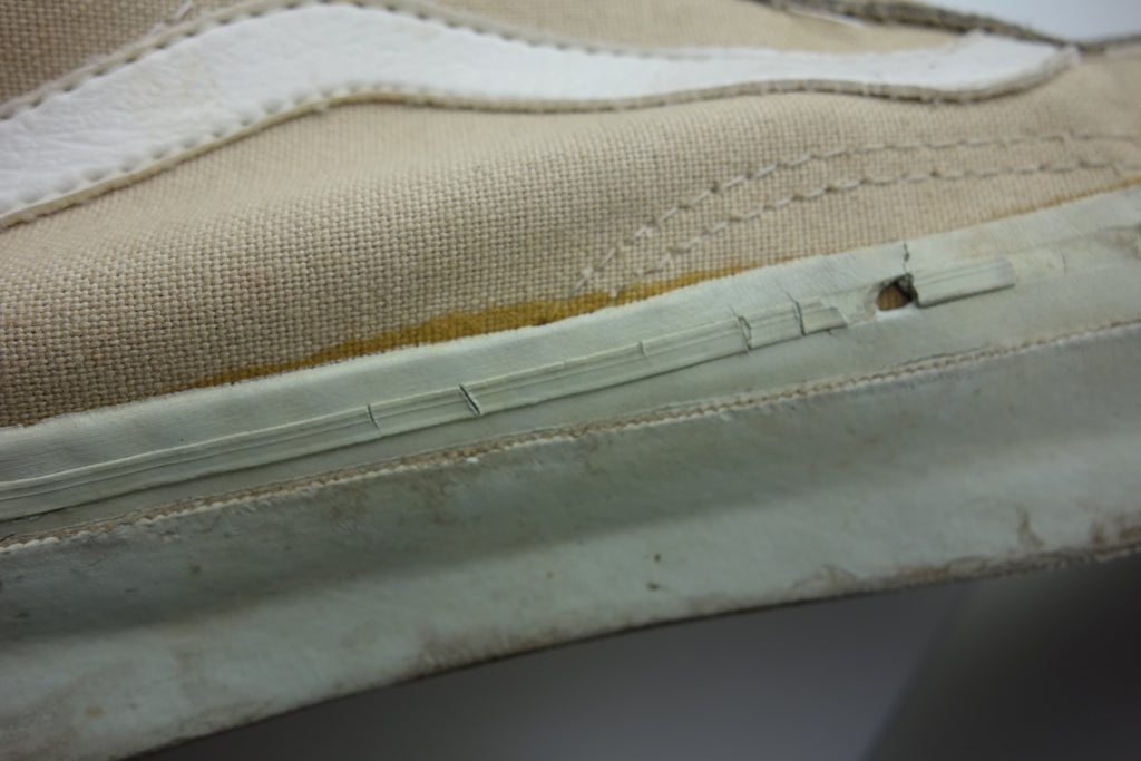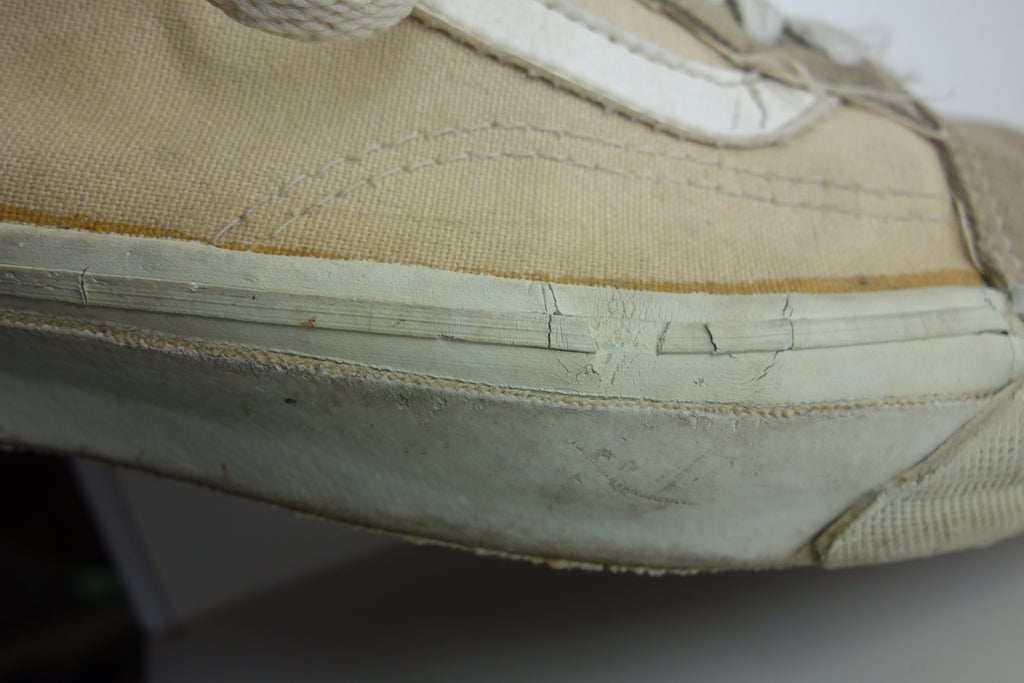 good used condition. sadly the foxing stripe has cured/solidified & will continue to crack, flake away & erode into the first foxing below. the toes have almost exclusively brittle however the bumper, friction & waffle itself are unaffected. rubber loss will continue at the bends & however unsightly they will thereafter hold up to normal wear. the vinyl collar shows splitting mostly to the base however foam is not exposed. both insoles at the heel show peeling & erosion following removal of arch supports & may require thin insole repalcements. wear at own risk!