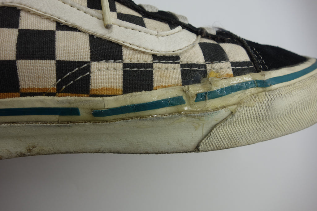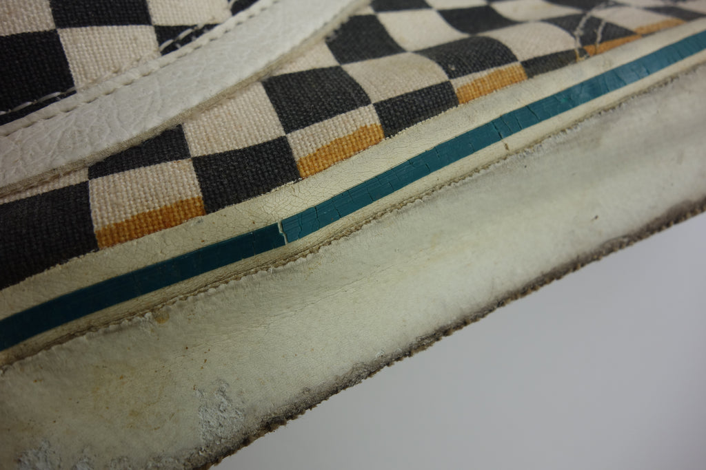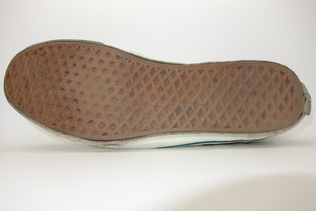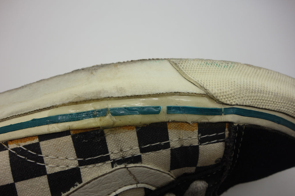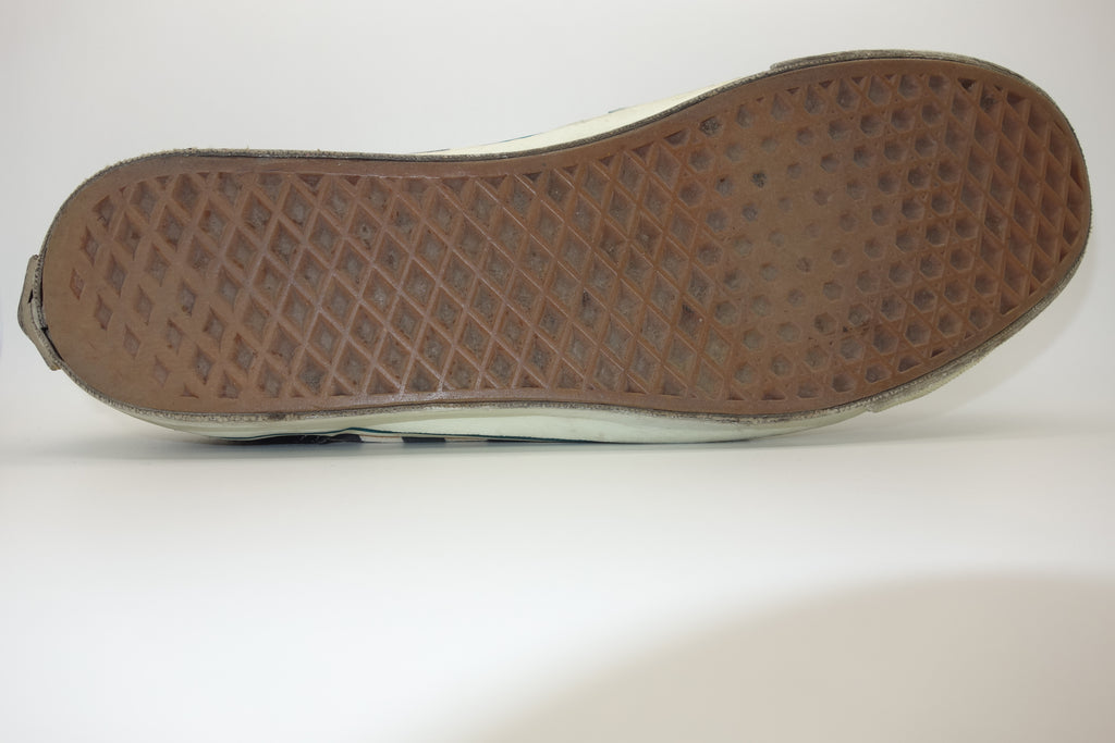 good used condition. sadly the foxing stripe has cured/solidified & will continue to crack, flake away & erode into the first foxing below. the toes have almost exclusively brittle however the bumper, friction & waffle itself are unaffected. rubber loss will continue at the bends & however unsightly they will thereafter hold up to normal wear. the vinyl collar shows splitting mostly to the base however foam is not exposed. wear at own risk!