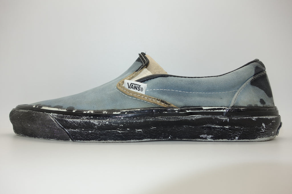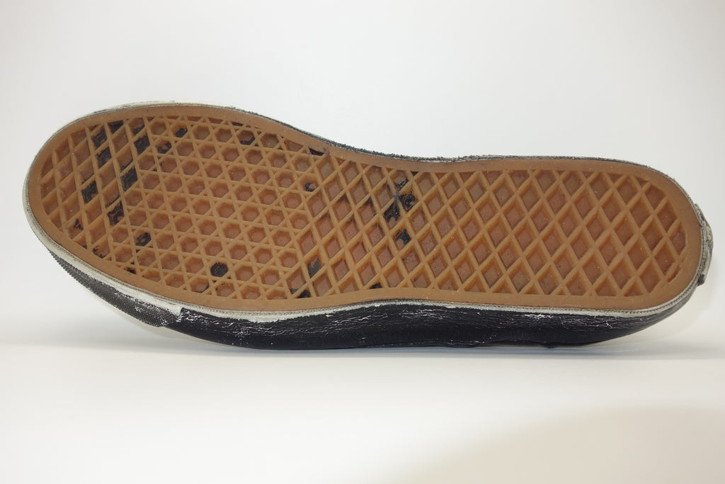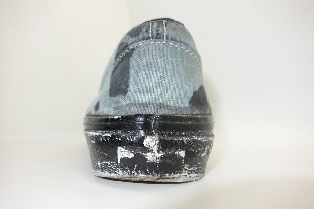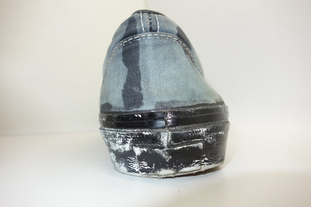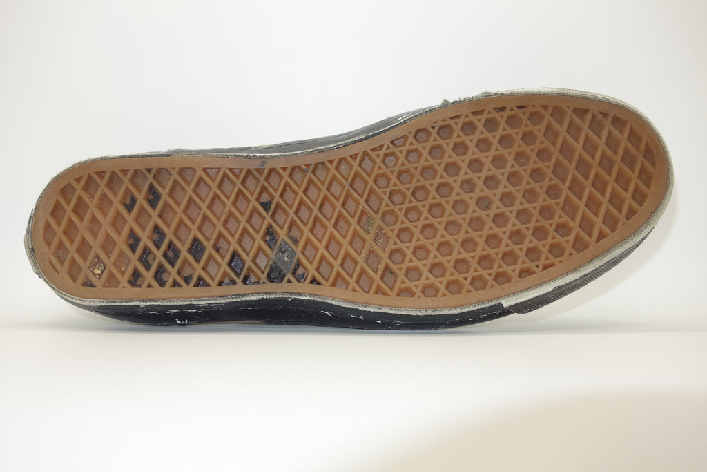 excellent used condition. these look kinda knackered but its predominantly surface. THESE WERE ORIGINALLY SOLID WHITE but were diy customised with fabric dye. the midsole was painted with black acrylic paint. the paint will continue to flake away with wear at bends. otherwise they are barely worn & all rubber remains soft & flexible.