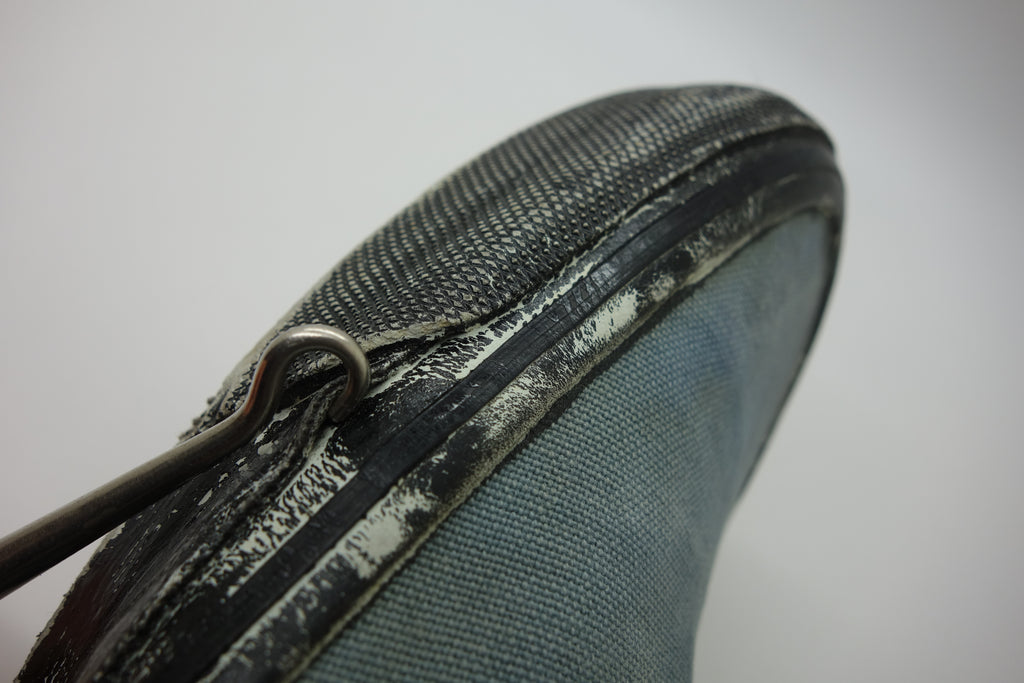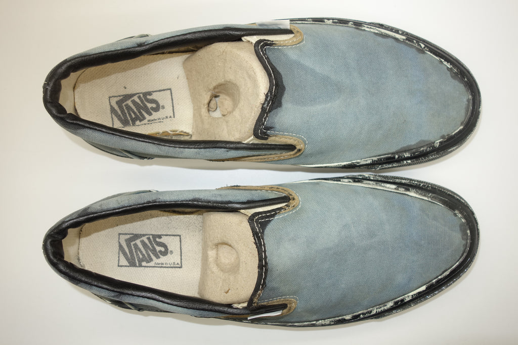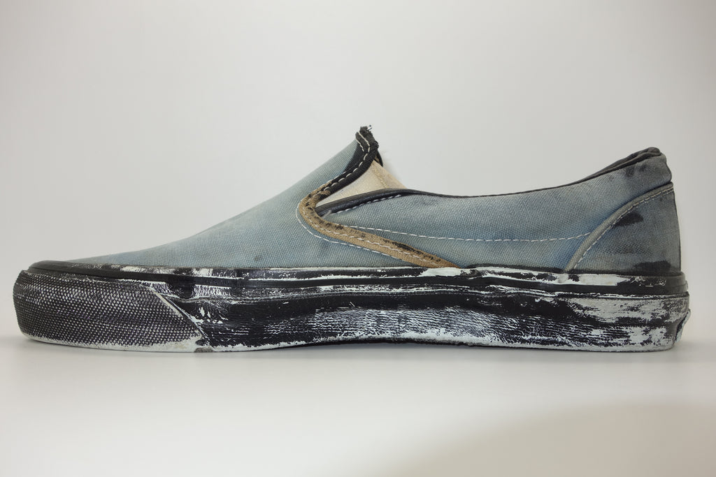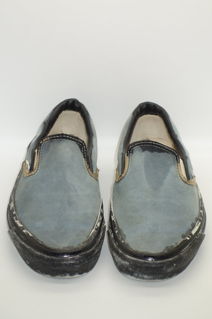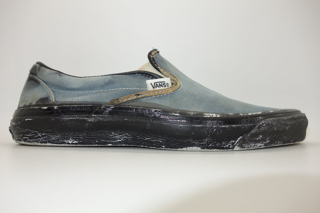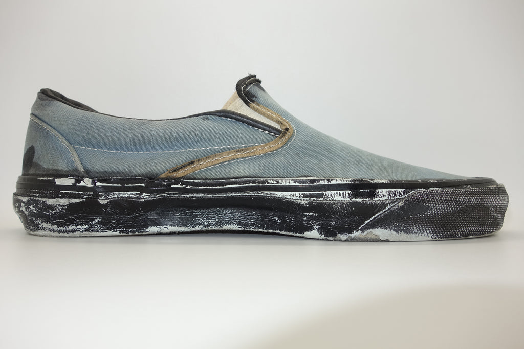 excellent used condition. these look kinda knackered but its predominantly surface. THESE WERE ORIGINALLY SOLID WHITE but were diy customised with fabric dye. the midsole was painted with black acrylic paint. the paint will continue to flake away with wear at bends. otherwise they are barely worn & all rubber remains soft & flexible.