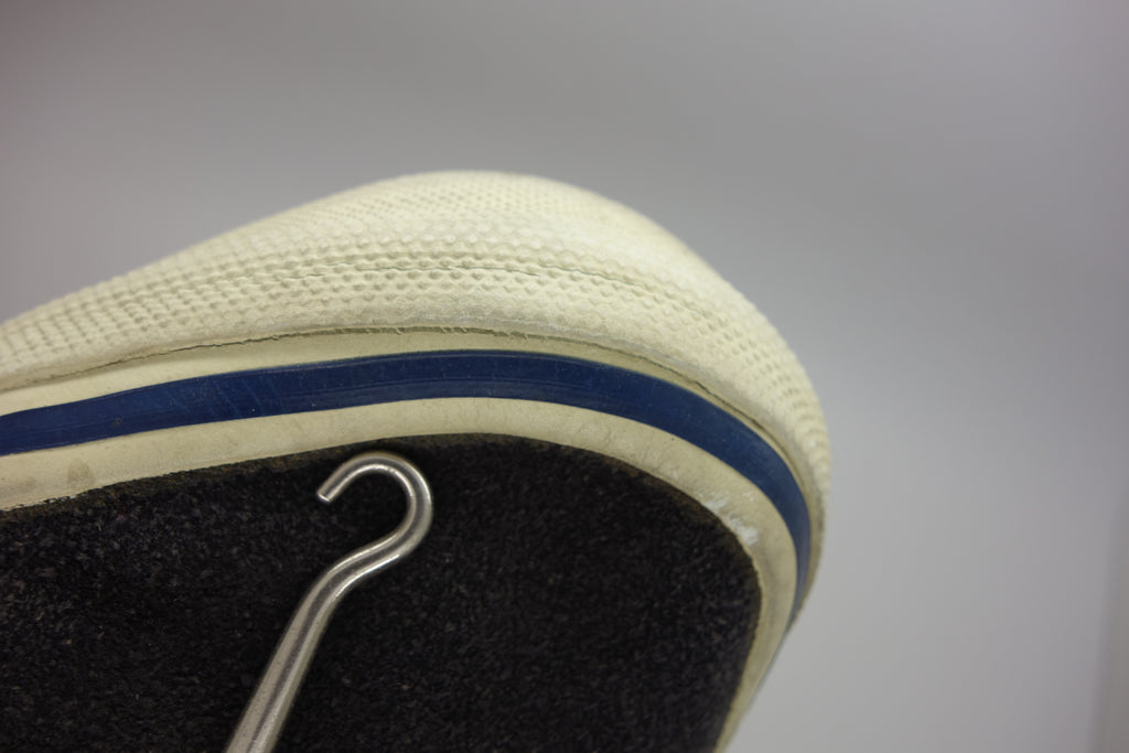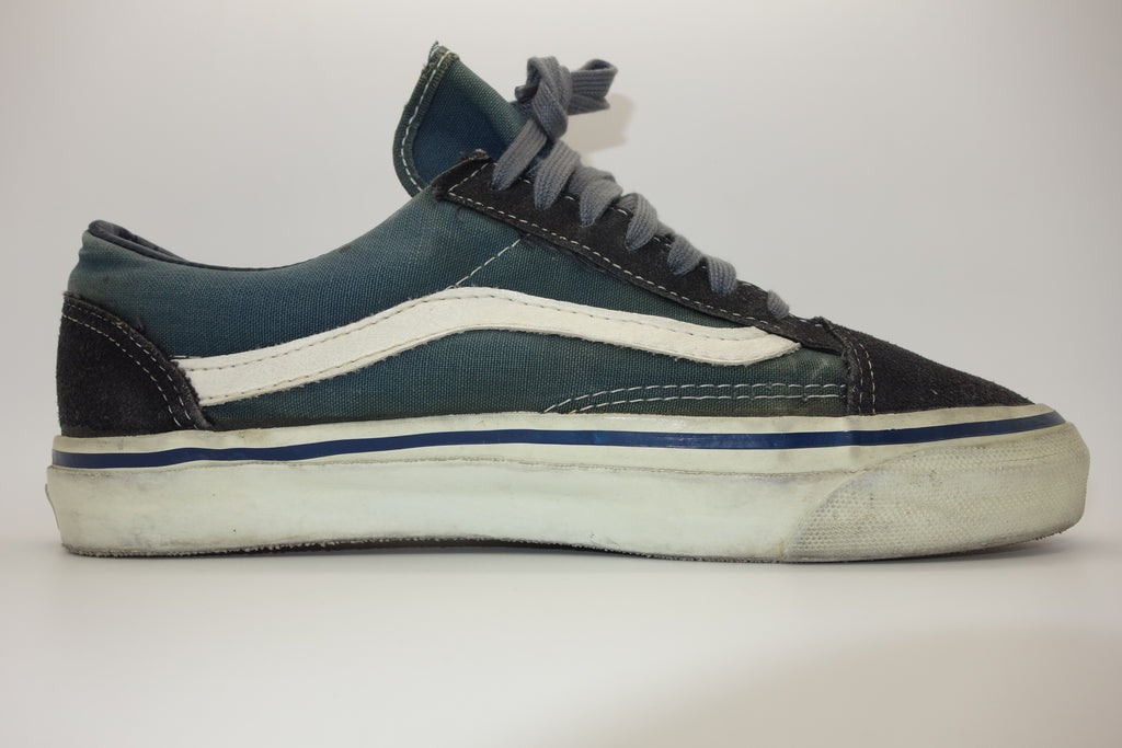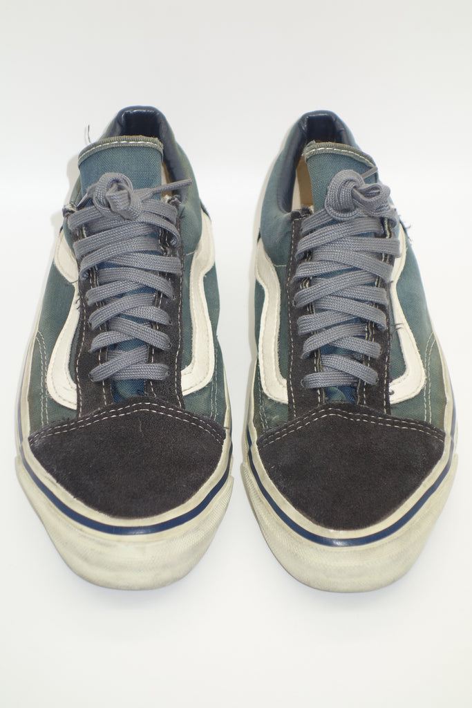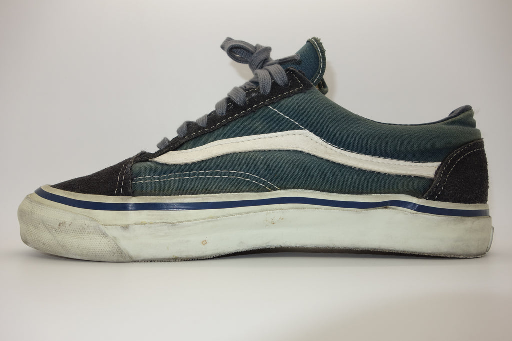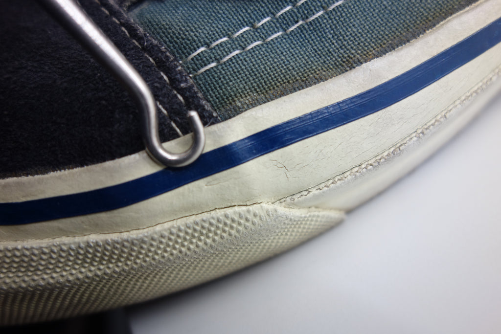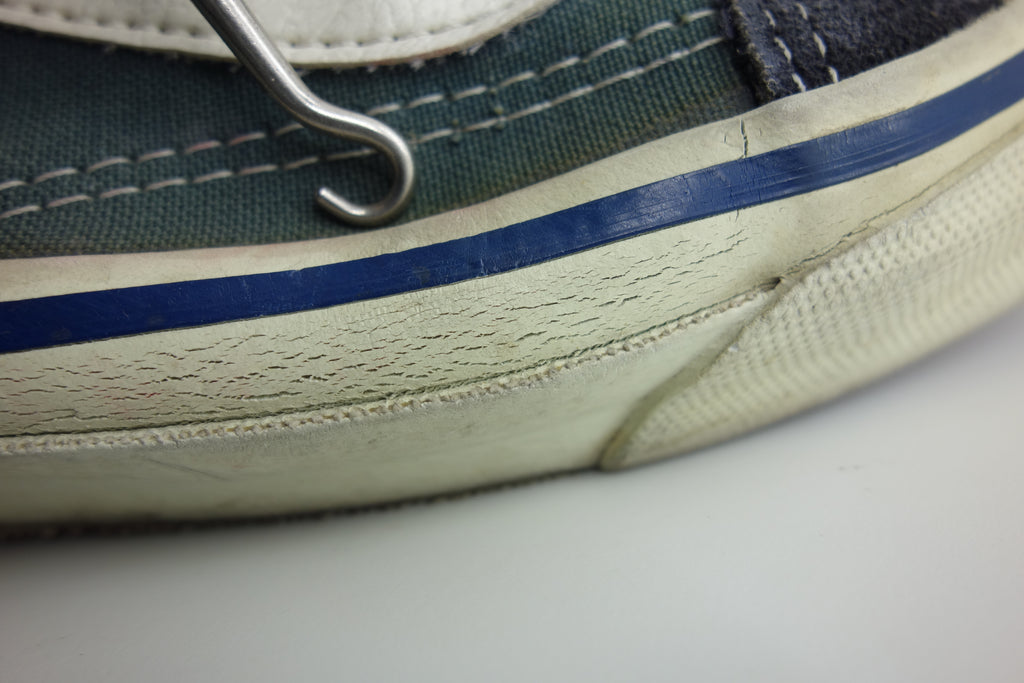 very good used condition. rubber remains soft throughout. some minor separation from uppers at toes creases & minimal stress cracking but will hold up to normal wear. thin tongue wont deteriorate. fade to canvas gives greenish tones. womens sizes fit narrow & suit best womens feet or men with narrow-normal feet. laces not original