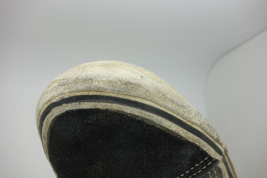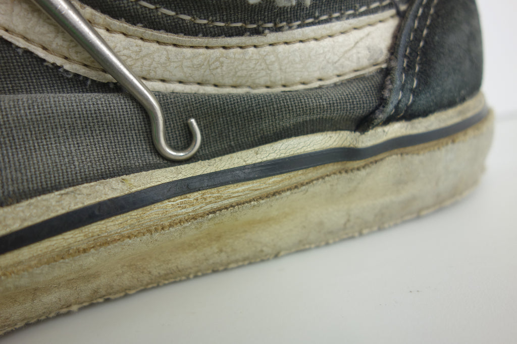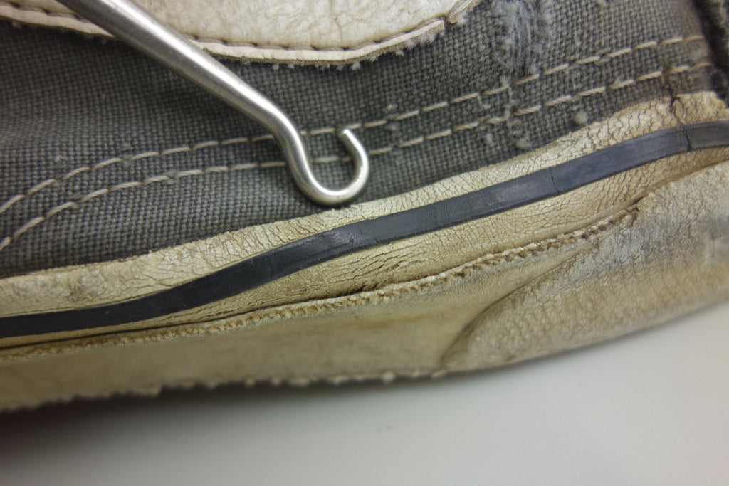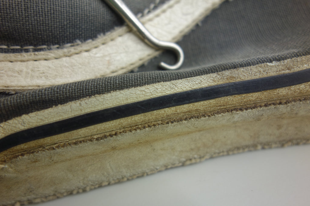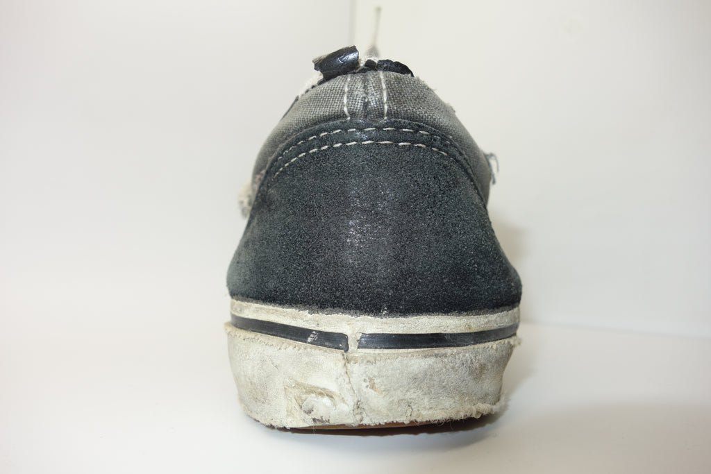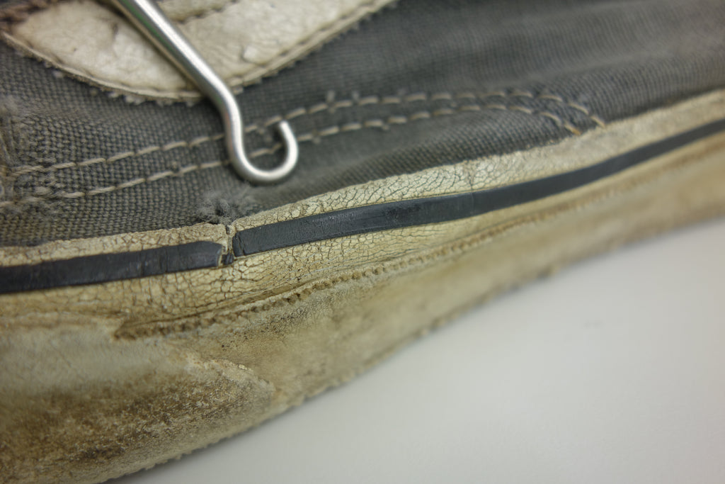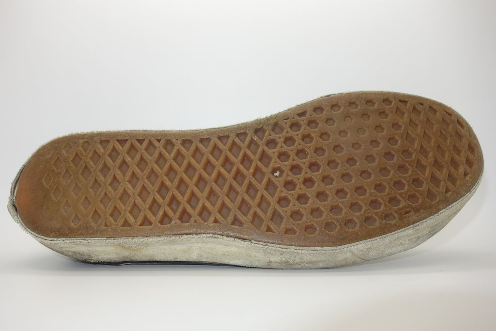decent used condition. all rubber remains soft & flexible except the waffle which has hardened & become slick. from experience only the top layer of waffle is hard & with wear will soften, but initially will be slippery. otherwise the midsole remains soft despite dryness/curstyness & widespread micro stress cracking. several small areas of separation between ruber & uppers. vinyl collar shows splits on both shoes & exposure to foam webbing. some footbed & inner lining wear.
