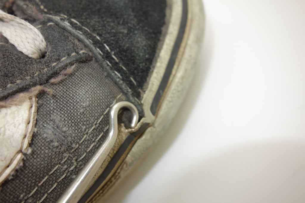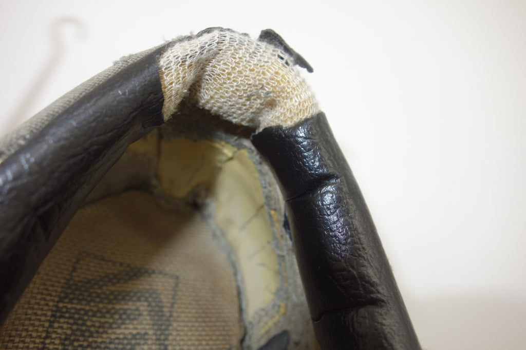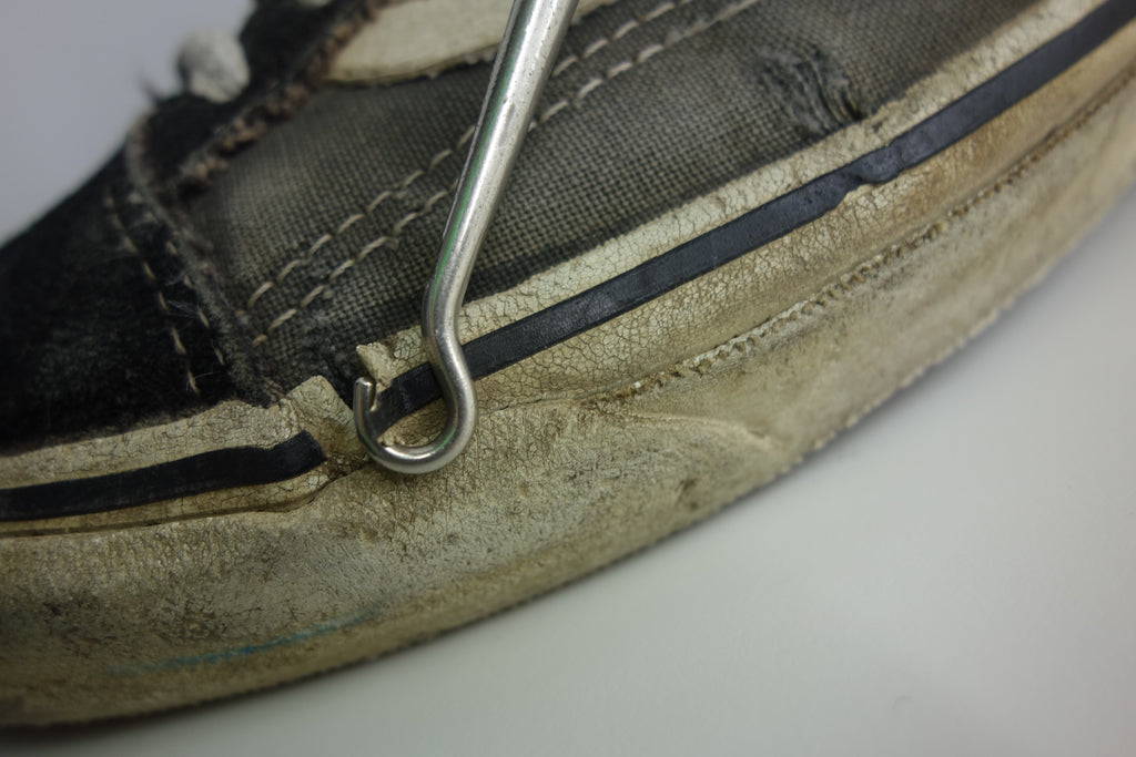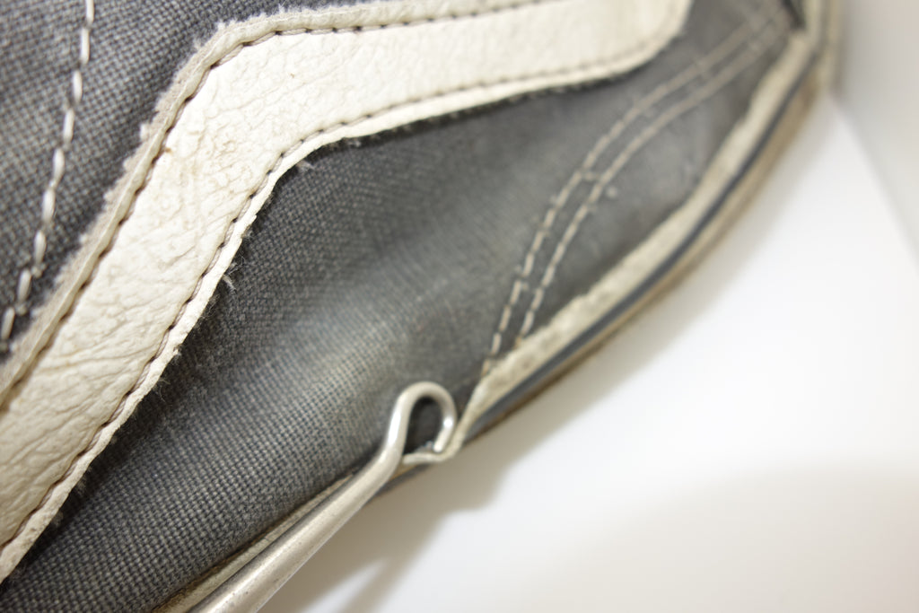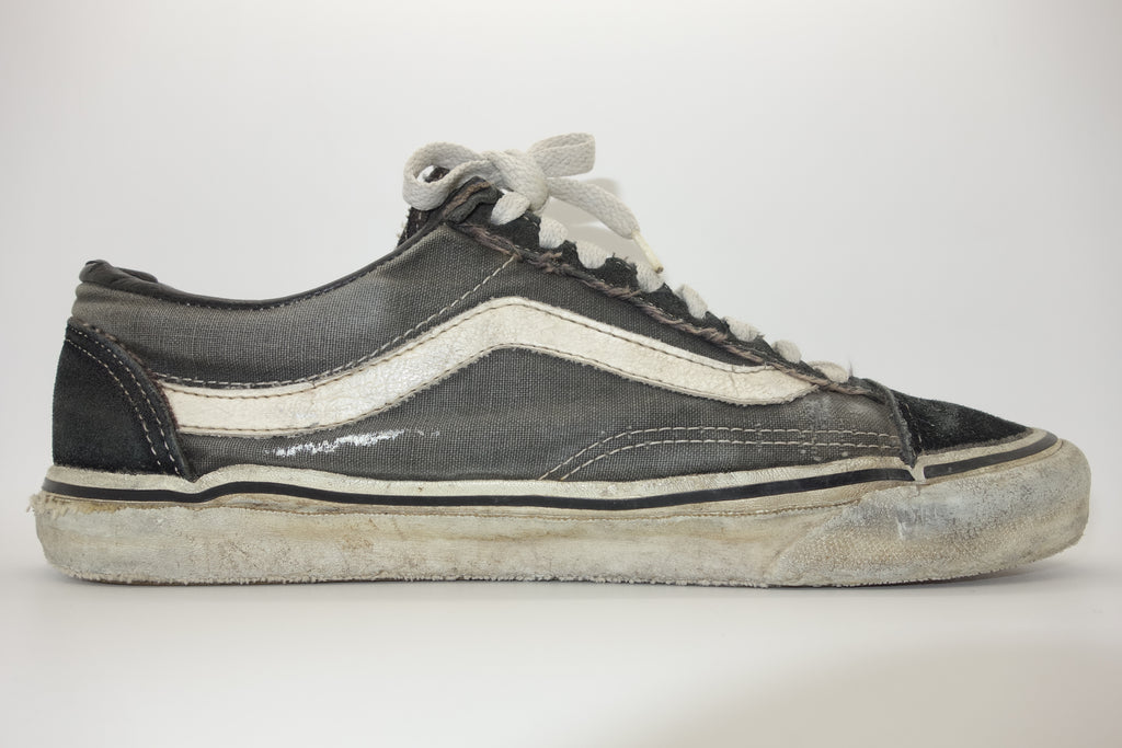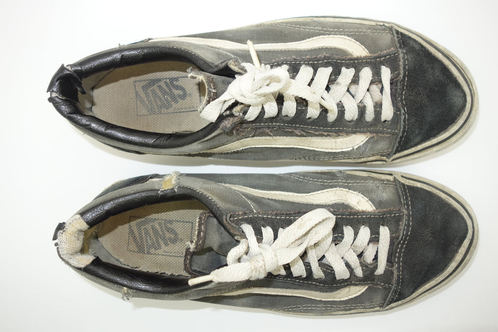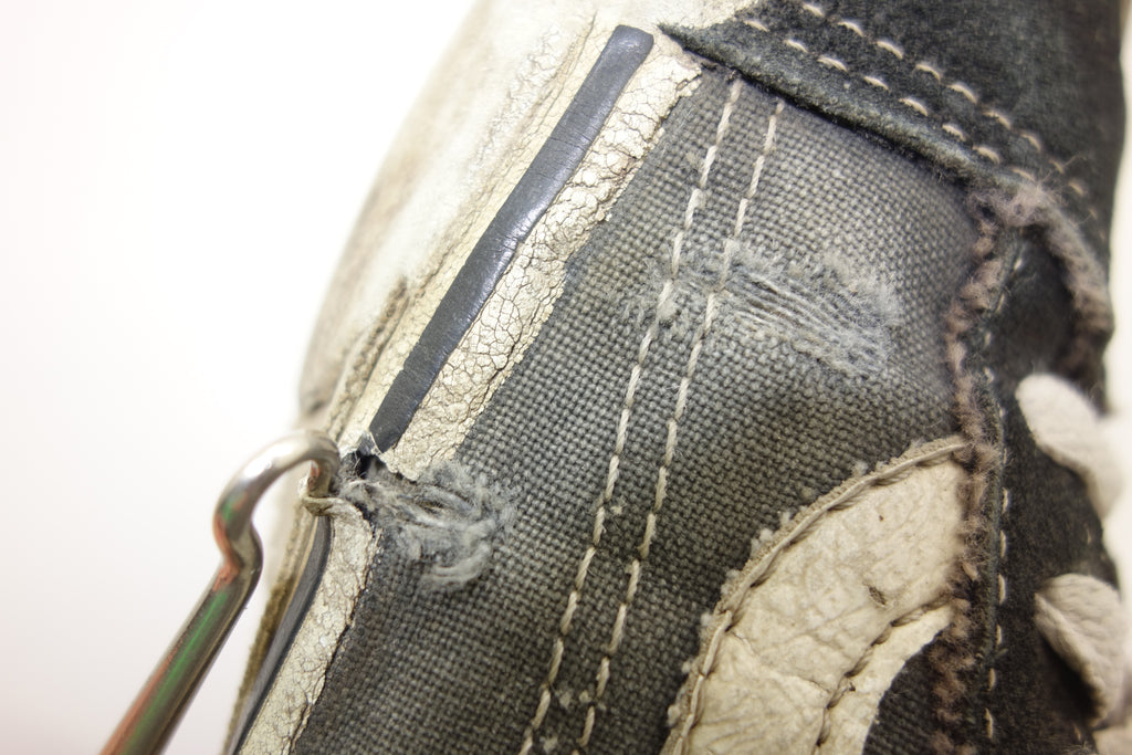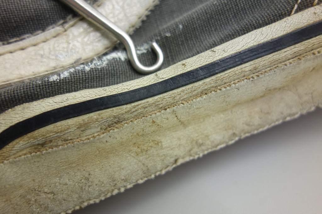 decent used condition. all rubber remains soft & flexible except the waffle which has hardened & become slick. from experience only the top layer of waffle is hard & with wear will soften, but initially will be slippery. otherwise the midsole remains soft despite dryness/curstyness & widespread micro stress cracking. several small areas of separation between ruber & uppers. vinyl collar shows splits on both shoes & exposure to foam webbing. some footbed & inner lining wear.