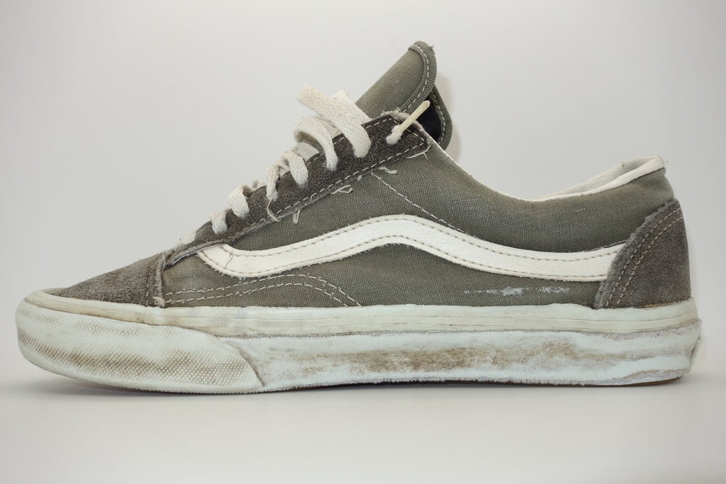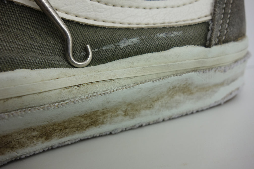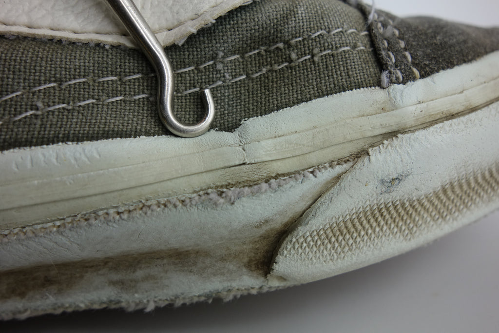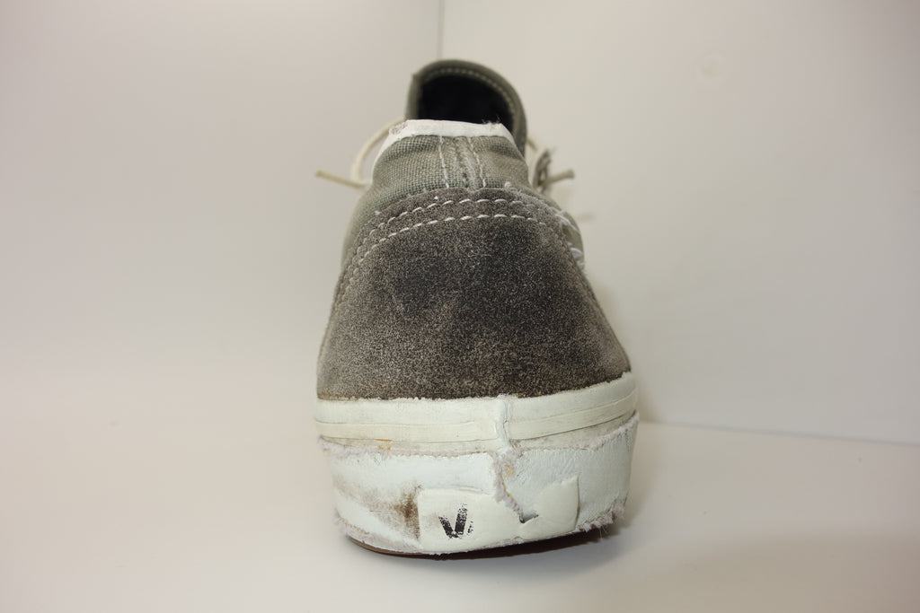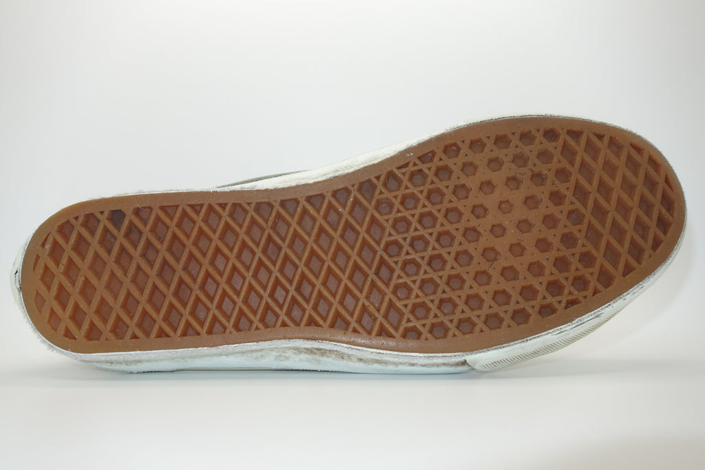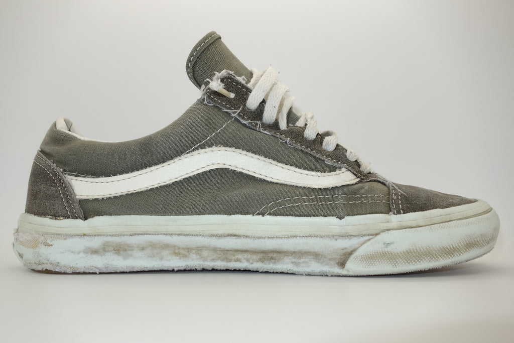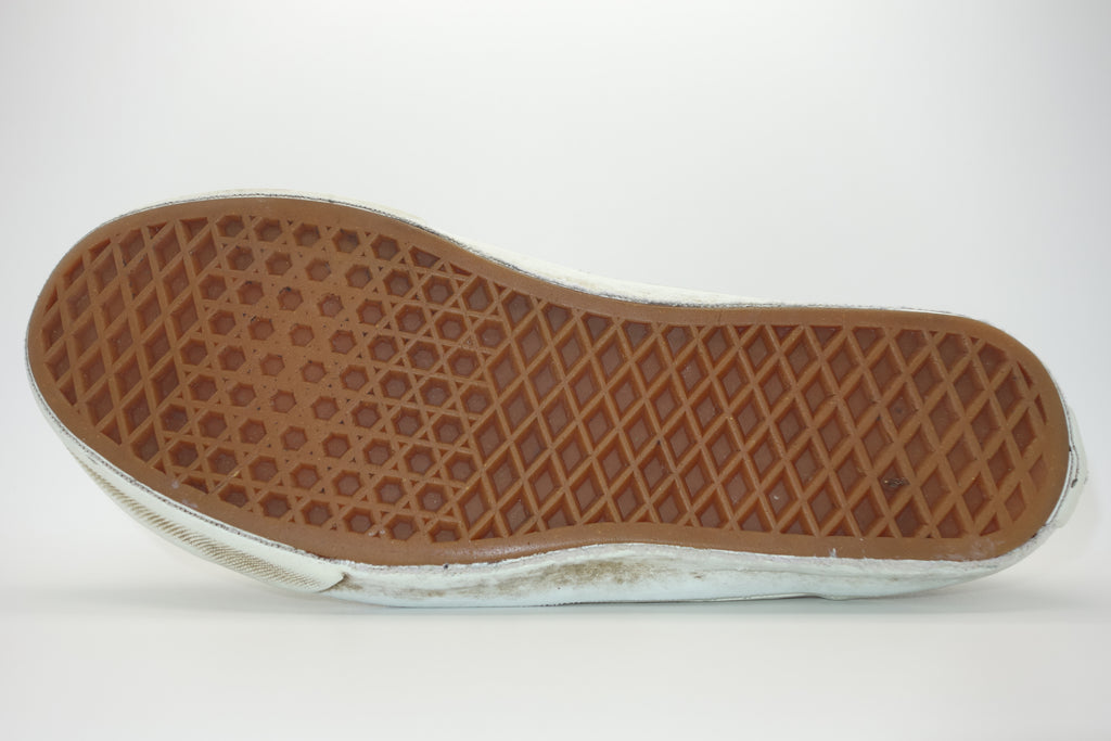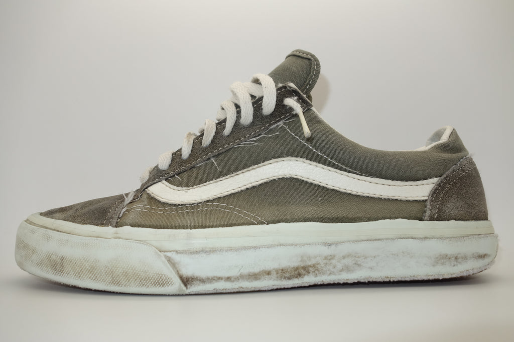 good used condition. the first foxing (stripe area) has cured/solidified & will continue to crack & flake away. the friction & waffle itself are unaffected.... apart from the heel repair which has hardened only in the lighter stained area. these will hold up to normal wear however with loss of rubber chunks upon bending zones & pressure points. wear to internal heel counter lining however the plastic is intact. the padded tongue of mid-late 90s vans is prone to deterioration. the foam on these has completely perished which has leff black residue inside the shoe & will turn socks black. some wear to insole at balls of feet