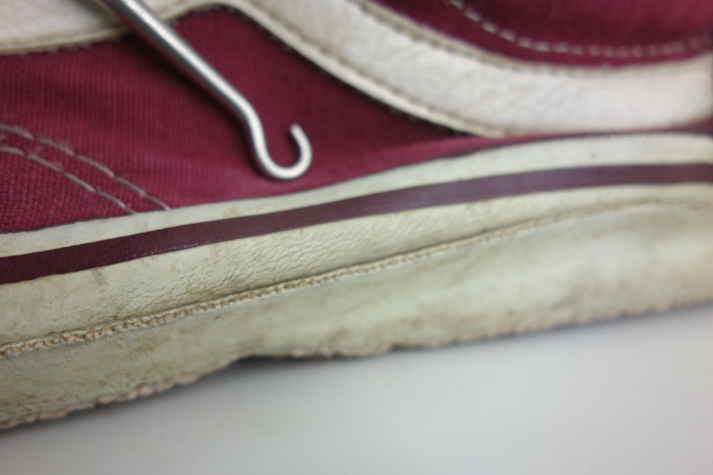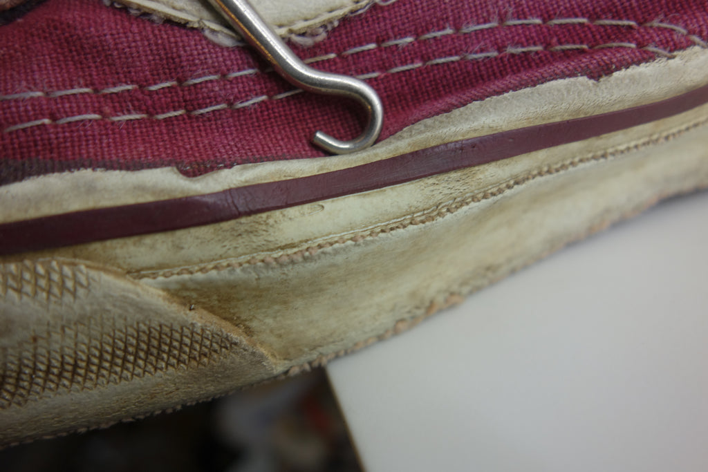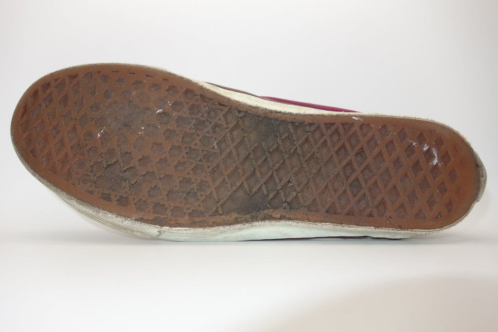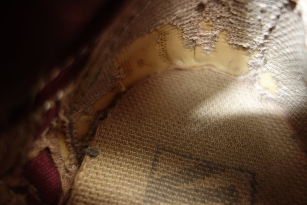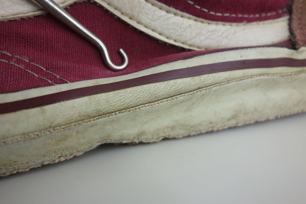 decent used condition. all rubber remains soft & flexible except for 1 tiny area at the left toe, which shows a hairline crack. the waffles show significant wear & erosion of gum due to bike pedals. some wear to the right vinyl collar. minimal wear to internal heel counter lining & but counter itself remains intact. well worn but well loved & structurally sound. size not visible but very confident of US9