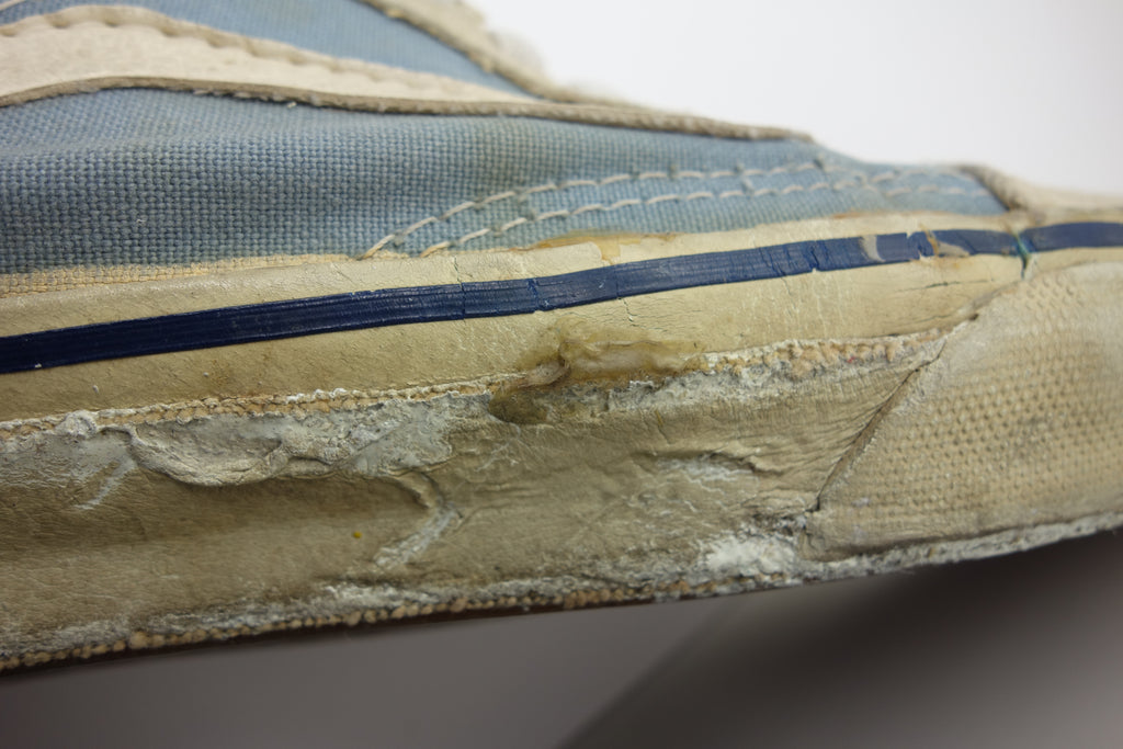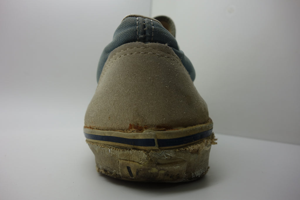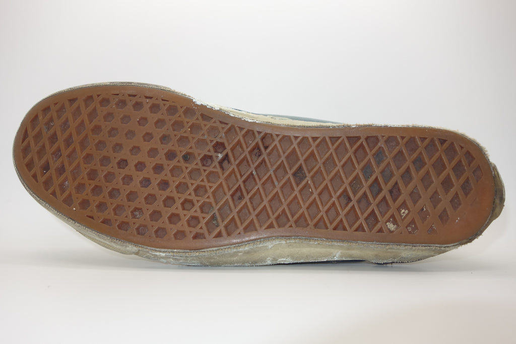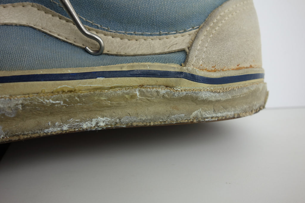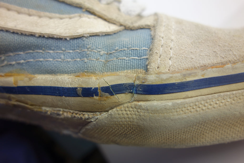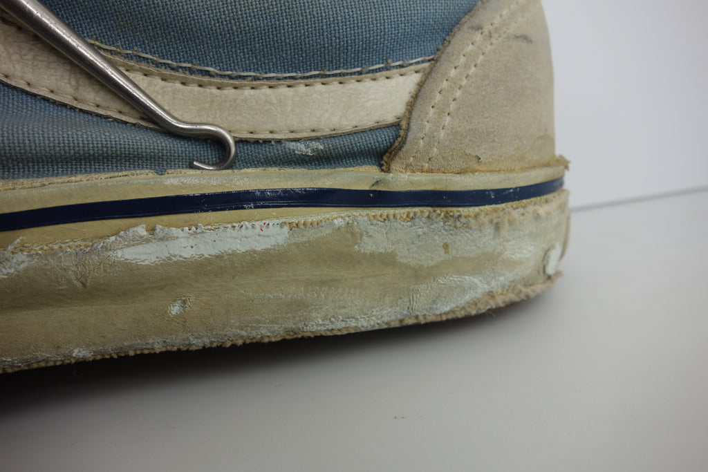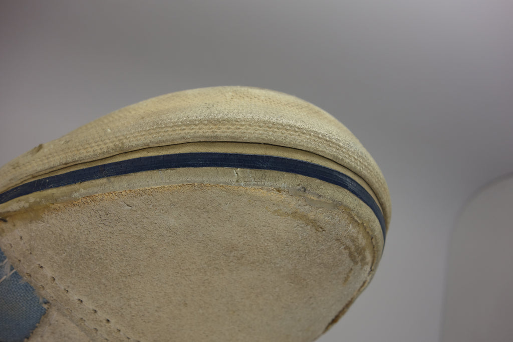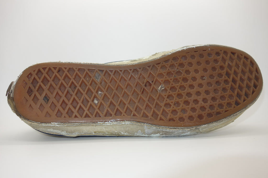 good used condition, however the rubber first foxing (stripe area) has completely cured/solidified & will crack & crumble upon bends. the cure also creeps into the top half of the friction sidewall. the lower half od the sidewall shows wet-rot however the tackiness has dried. there are some shoe-goo repairs but from experience these will leave a trail of rubber chunks then hold up to normal wear. the bumper & waffle itslef are unaffected. some wear to heel lining however internal counters remain intact. wear to the internl lining at toes through to suede. vinyl collar shows splitting & the insole is not crusty but firm. wear at own risk