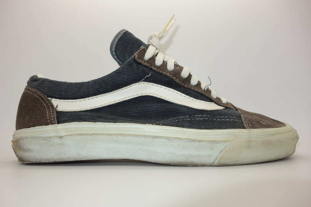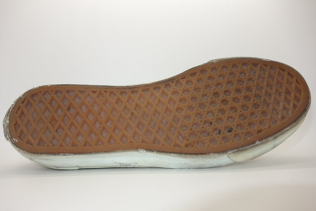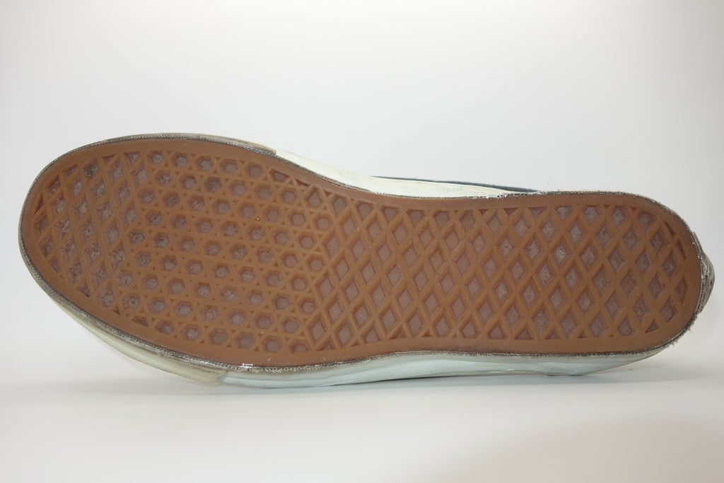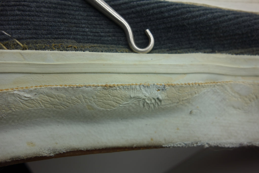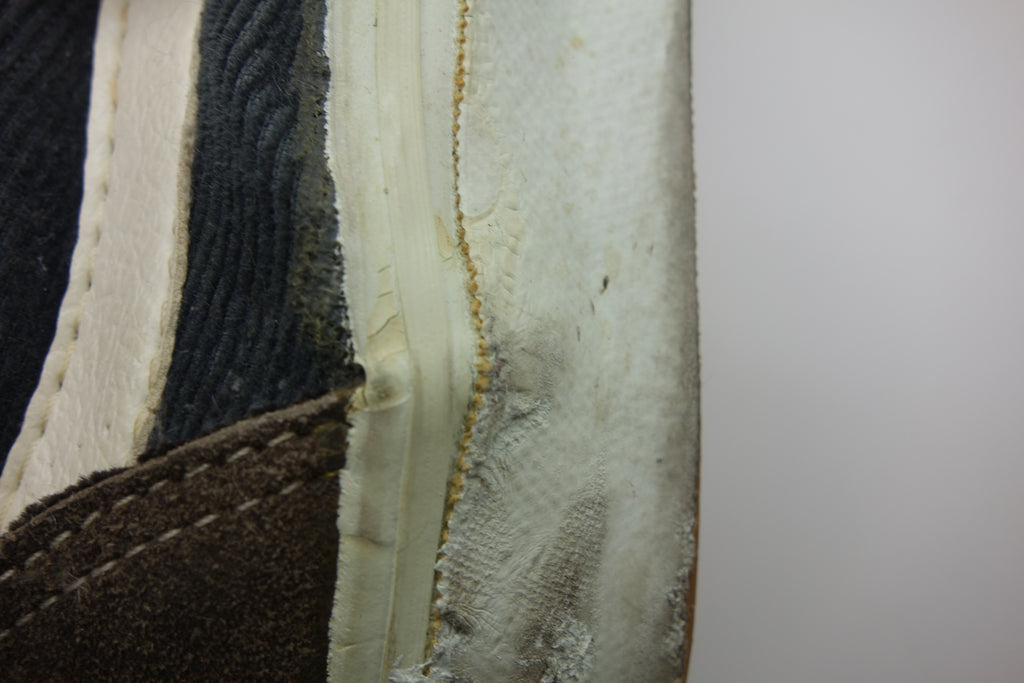 good used condition. the majority of rubber remains soft however there exists hardening in patches across the first foxing & friction. see photos for blotchy discolouration whereby the white areas remain soft while the creamy areas have cured. the creamy pacthes already show hairline cracking & will continue. i forsee these will succumb to slow crumble rather than immediate cracking. padded tongue may be prone to foam breakdown over time however remains now intact but flattened.... & may leave a black residue in shoes & on socks. wear at own risk!