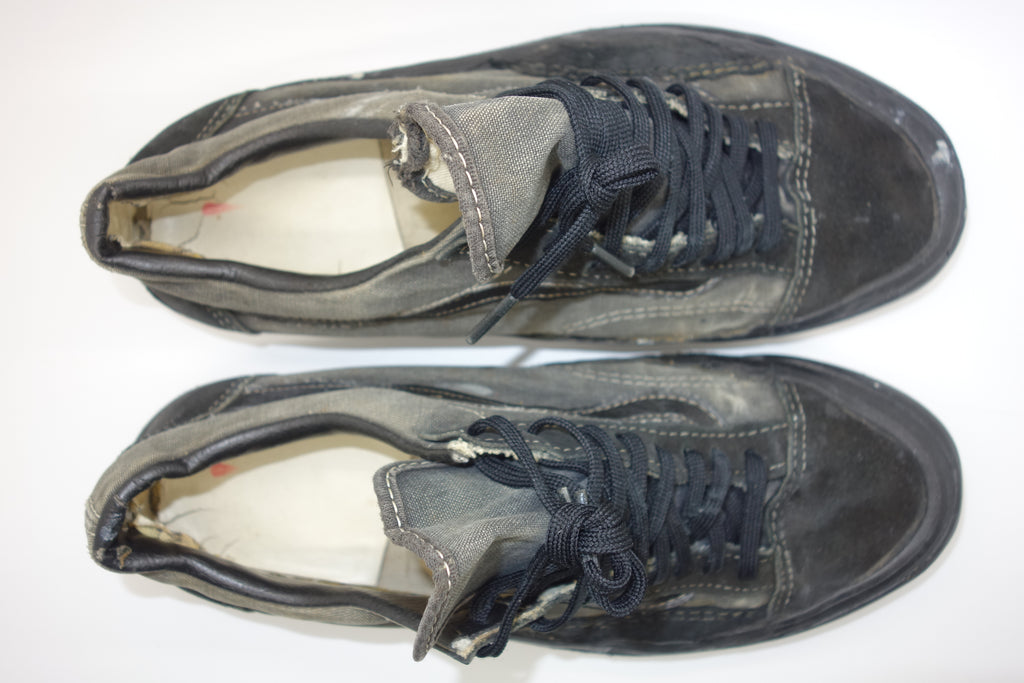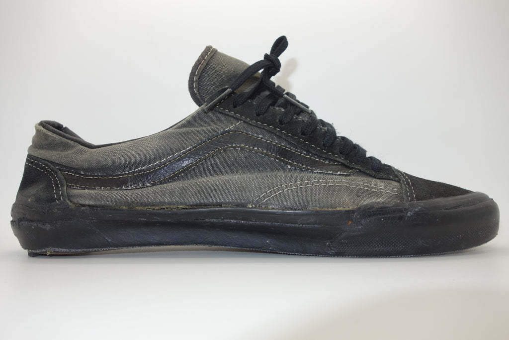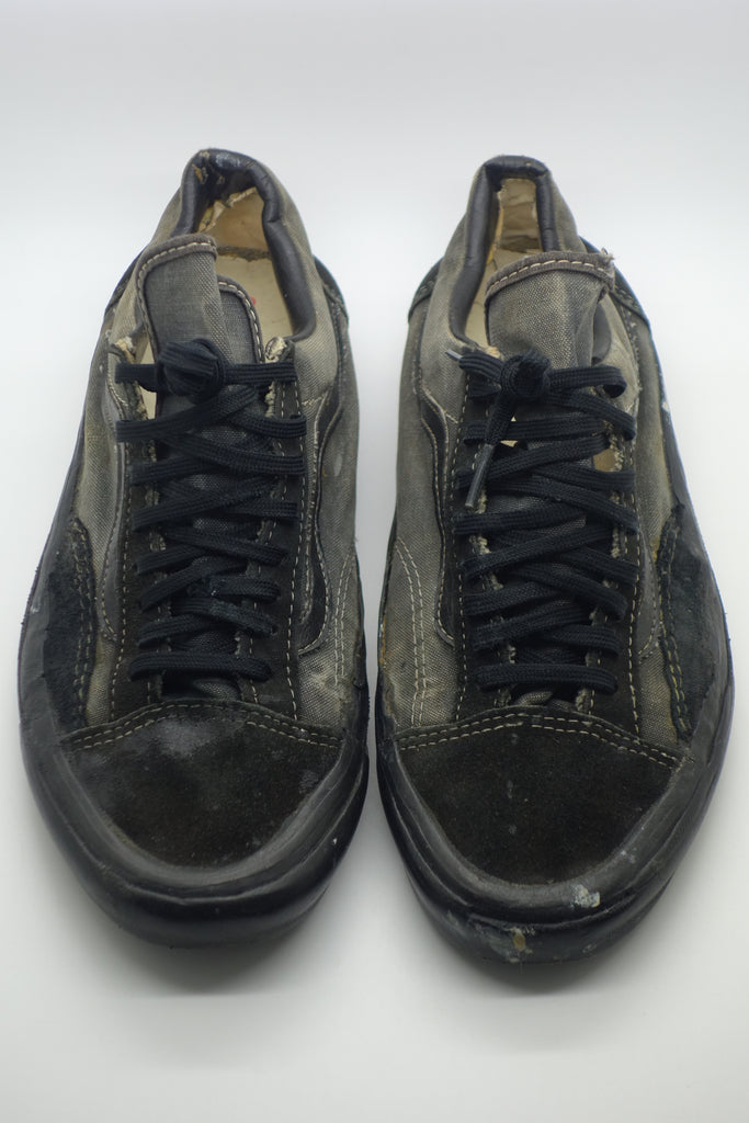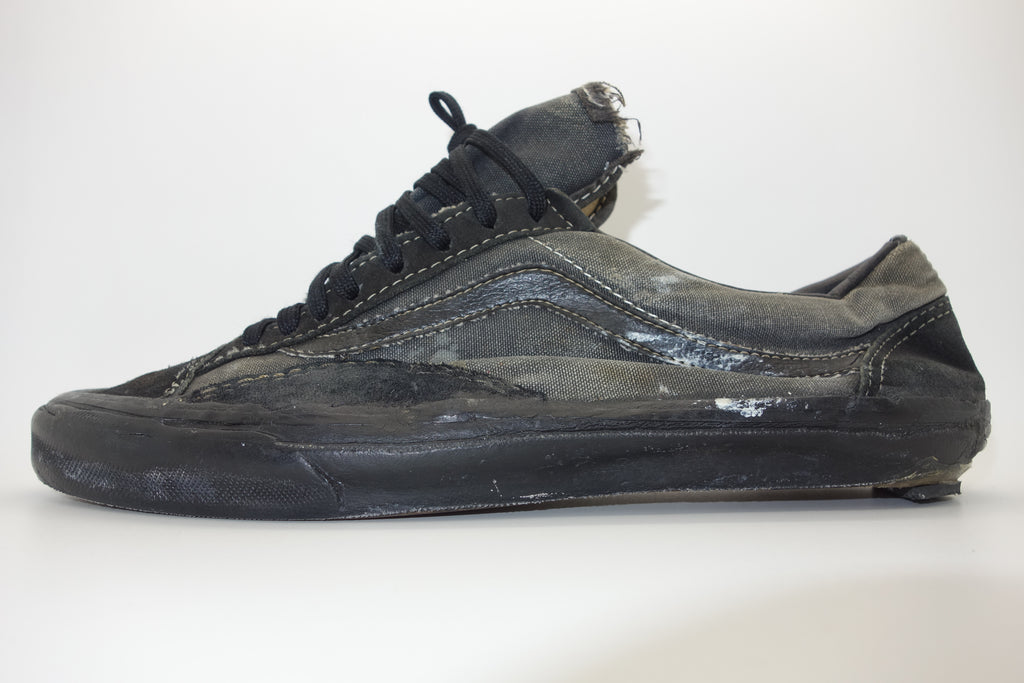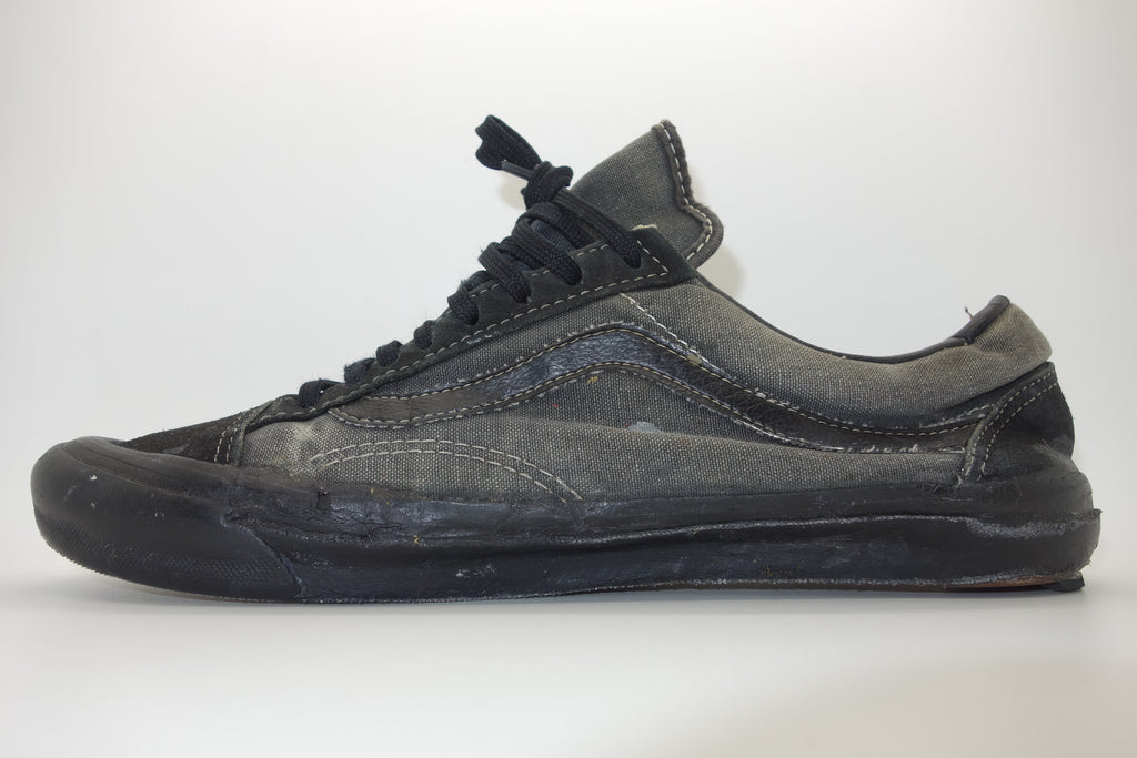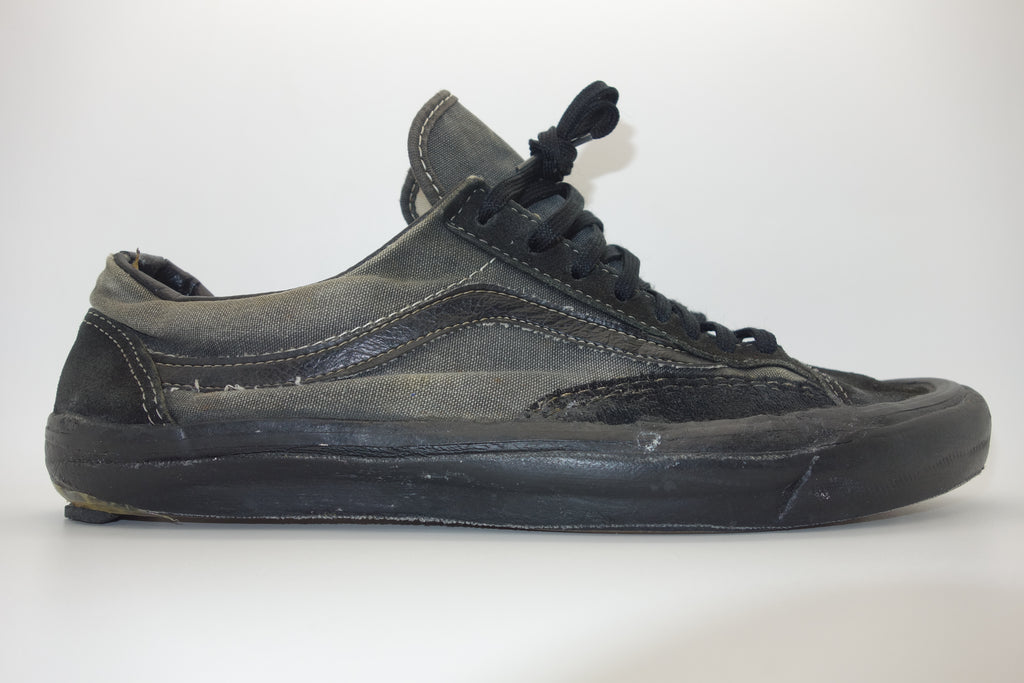 good used condition. all rubber remains soft despite rubber (wet rot? shoo-goo?) softening. the suede(?) ollie pad has been grafted diy! at first it looked like the bounce stitch excess canvas internally had been poked through the rubber somehow to create the pacth. upon closer inspection its possible a donor outsole or foxing stripe was sole-swapped. if it was swapped it was an of usa made source. the internal heel counter shows significiant breakdown & was also repaired cosmetically. the insole shows some erosion to ball of left foot & some on the right. also note the external heel guard on the waffle. these should hold up to normal wear.... however because of these alterations i advise to wear at own risk! size not visible but bought as US9.5 & confirdent of this, if not bigger. laces not original