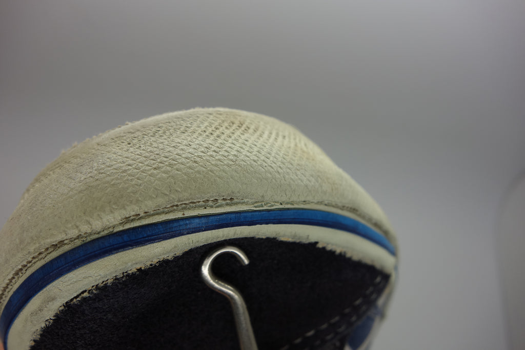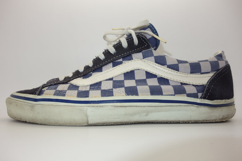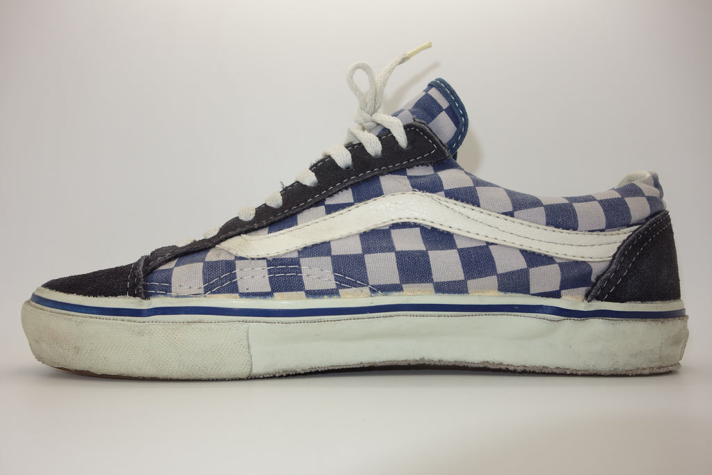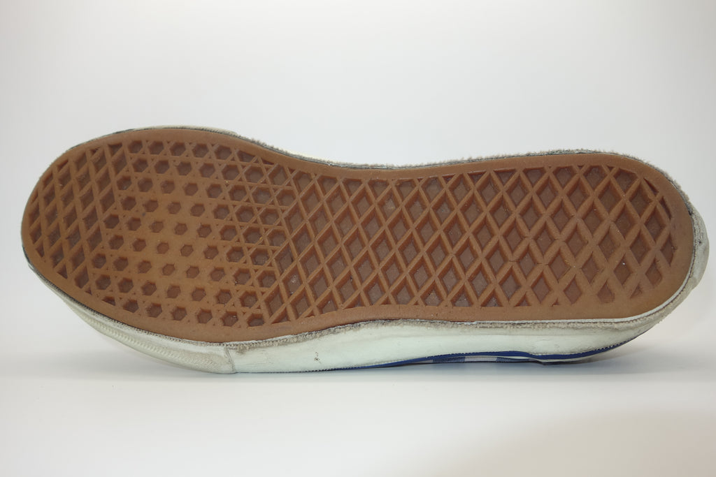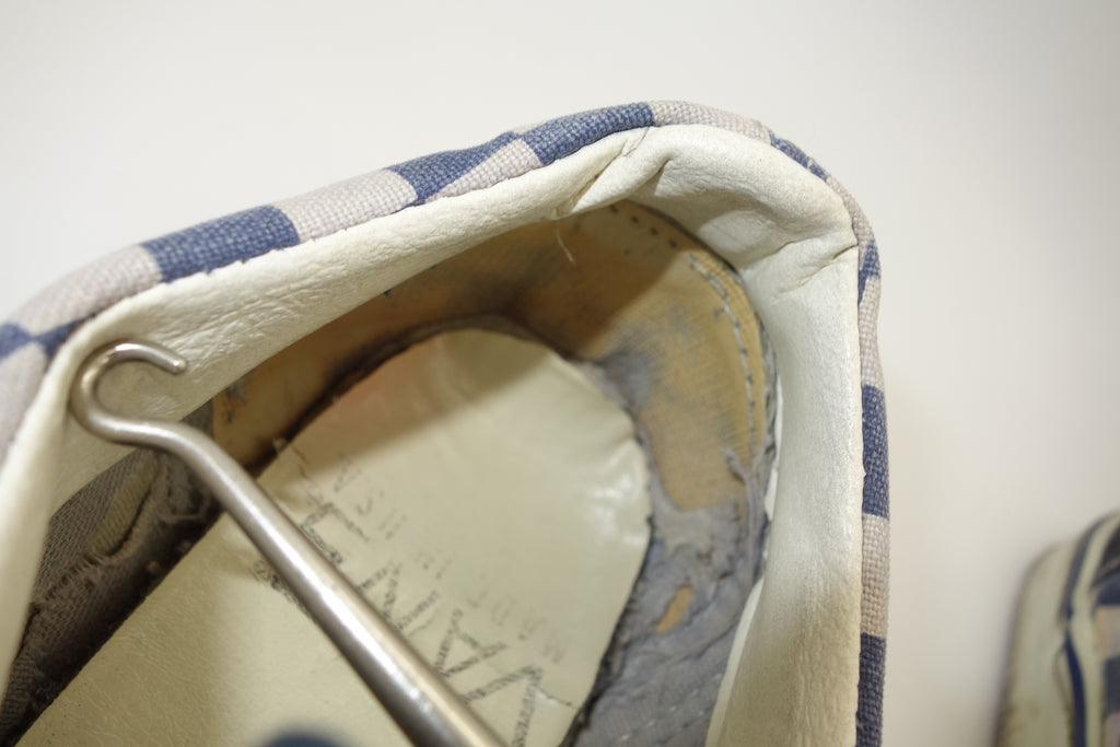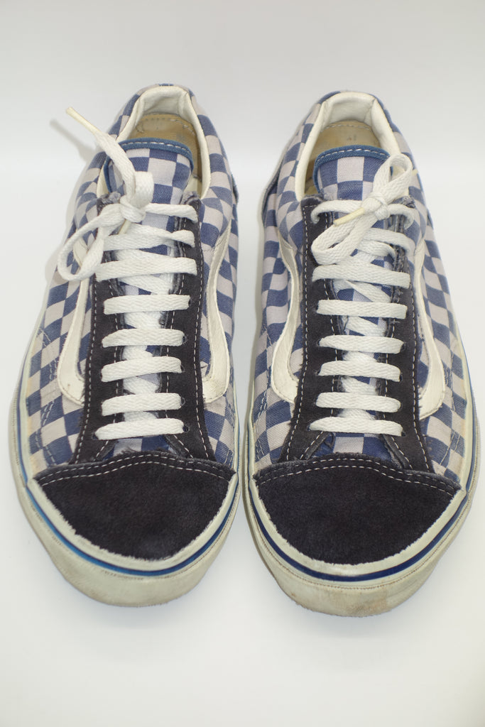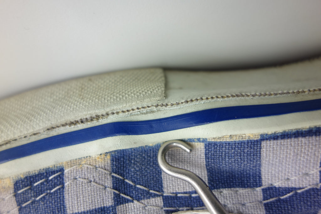 good used condition & all rubber remains soft & flexible despite some dryness & minor stress cracking from crush injury. some colour bleed from blue checks into whites. internal heel shows wear to lining however plastic counter remains intact.