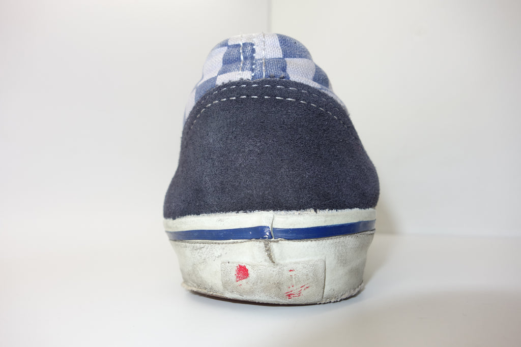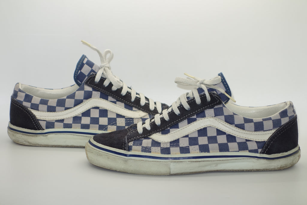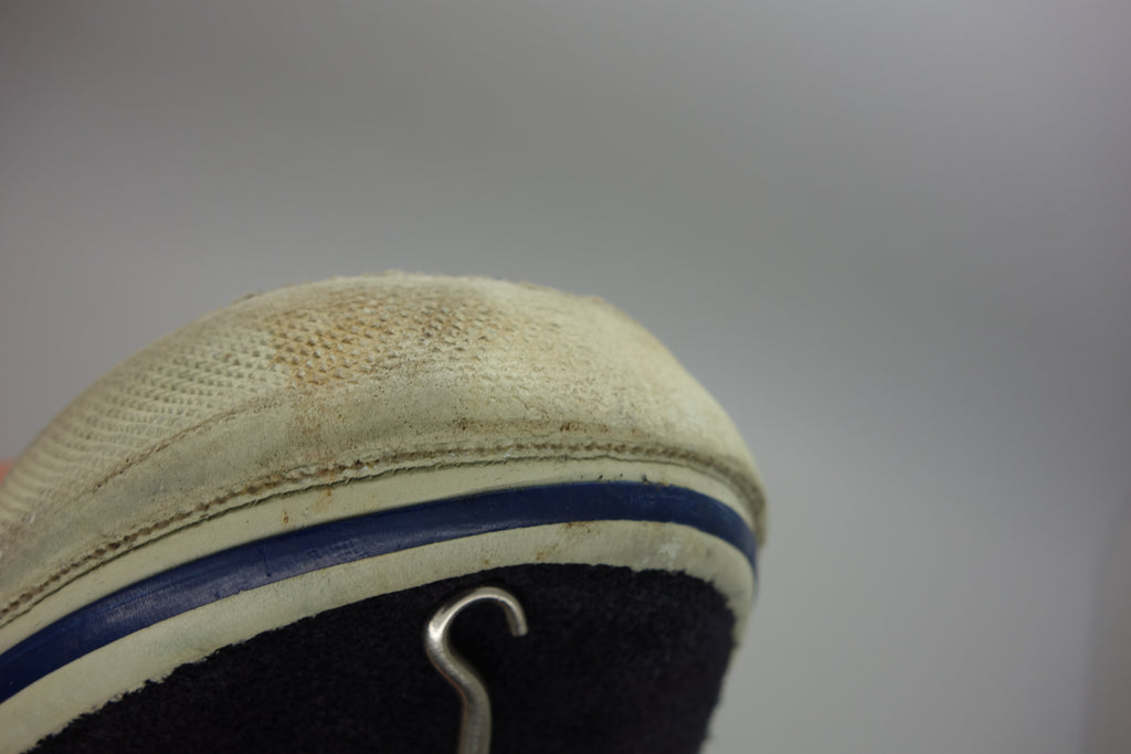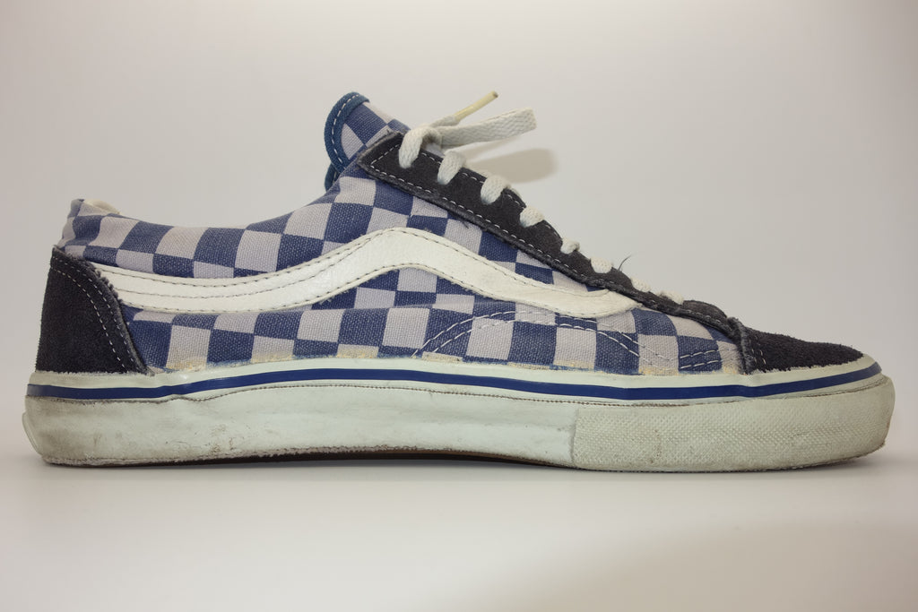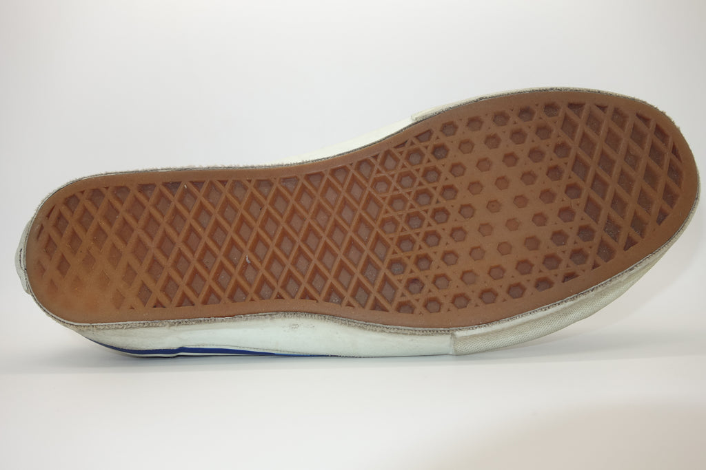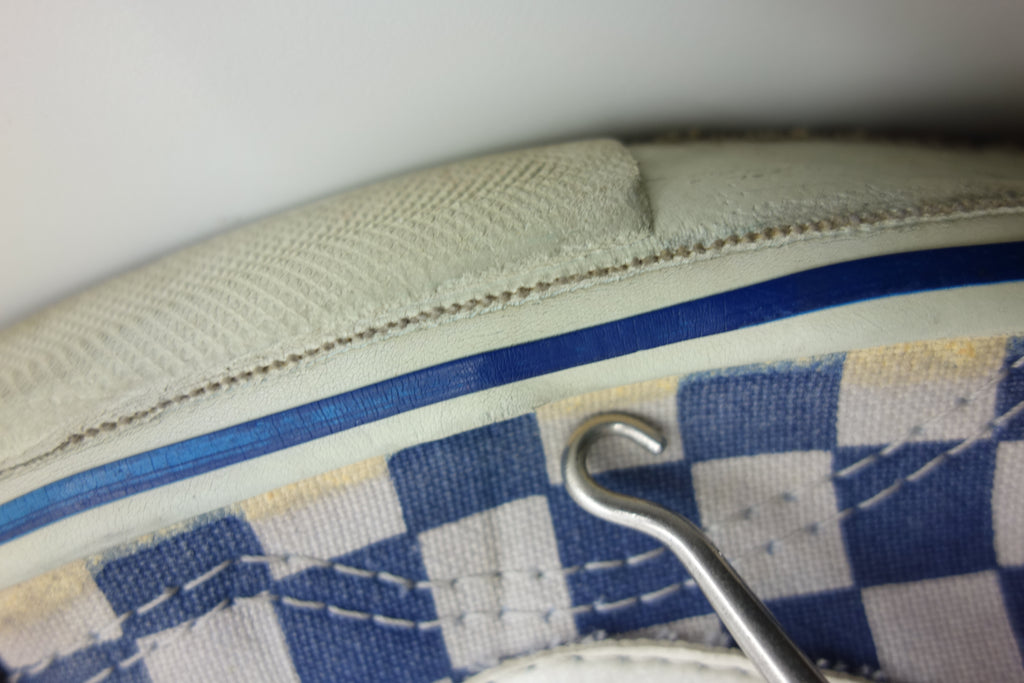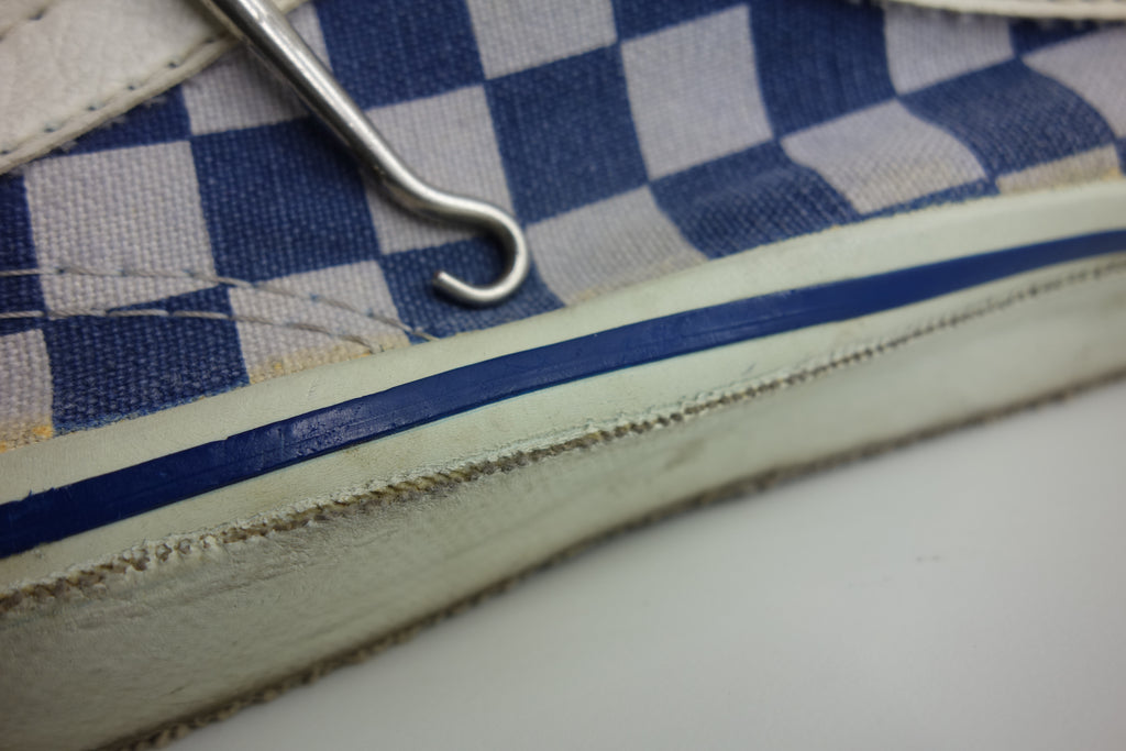 good used condition & all rubber remains soft & flexible despite some dryness & minor stress cracking from crush injury. some colour bleed from blue checks into whites. internal heel shows wear to lining however plastic counter remains intact.