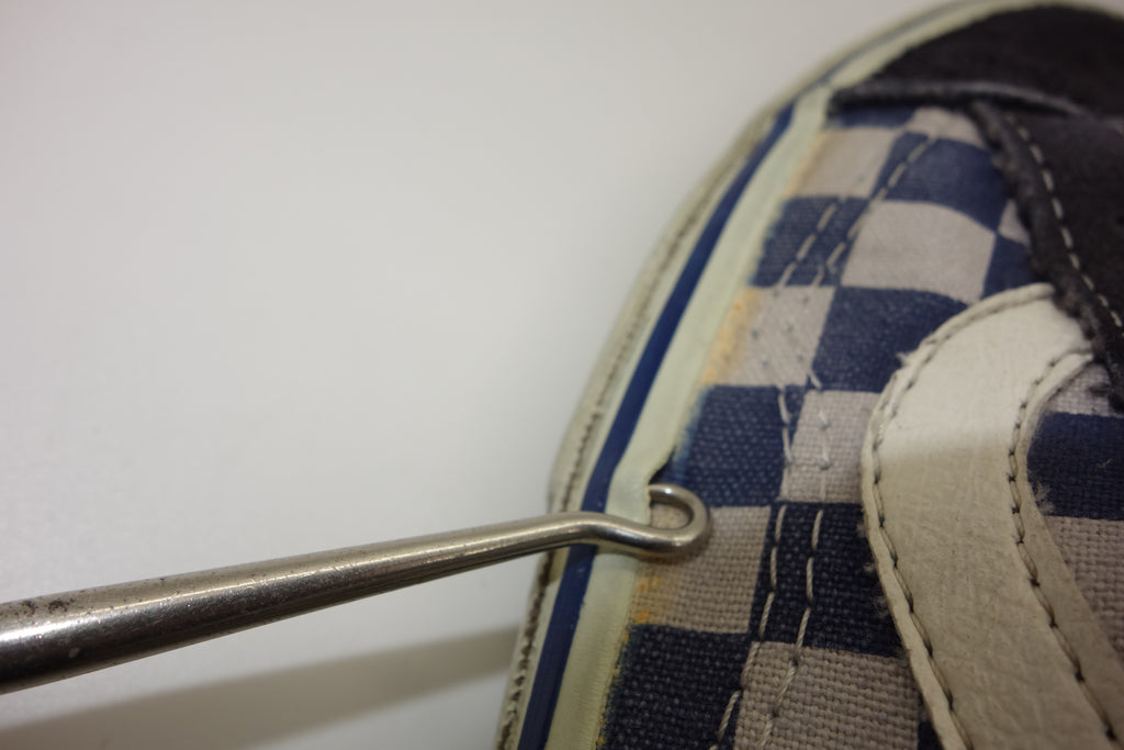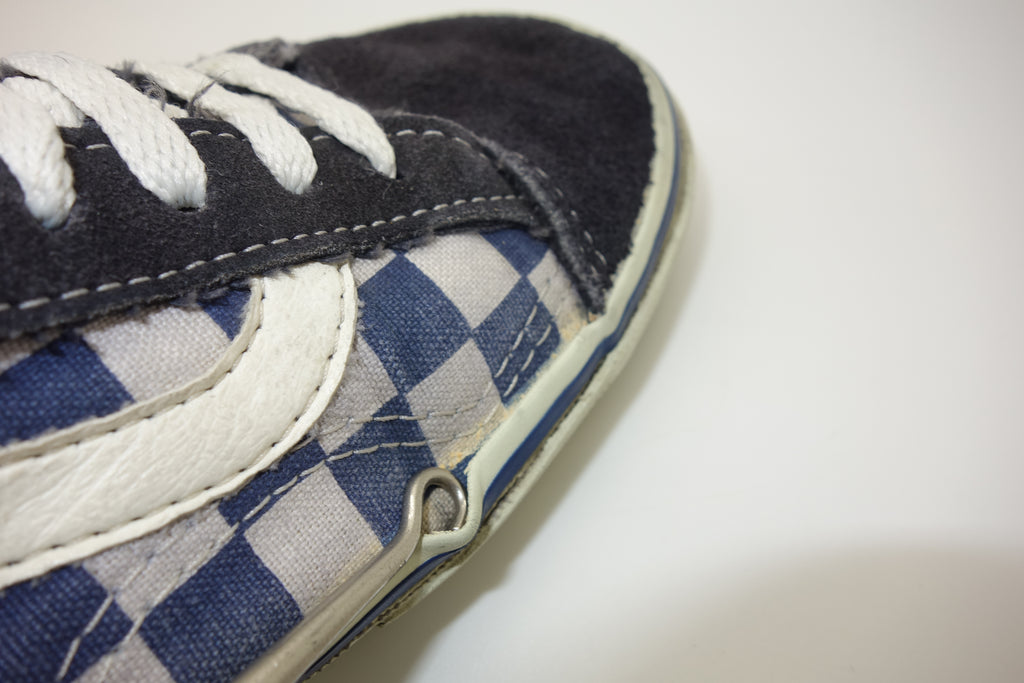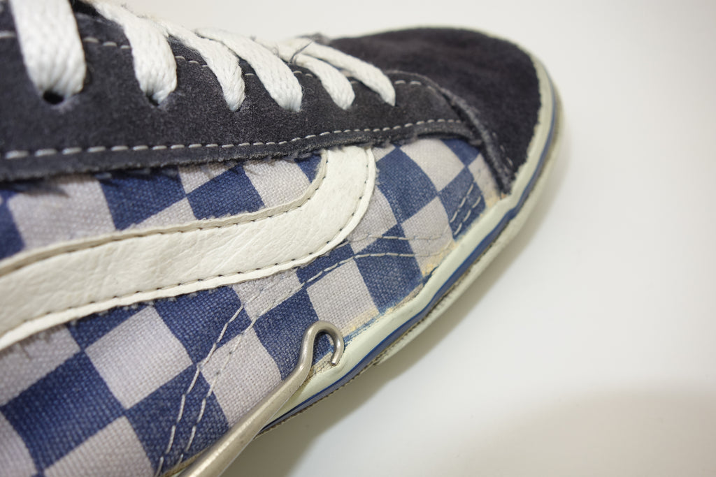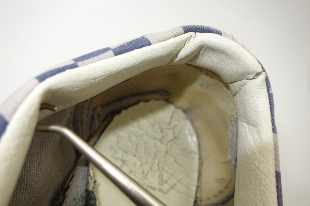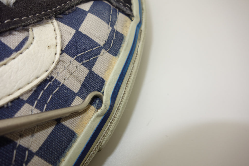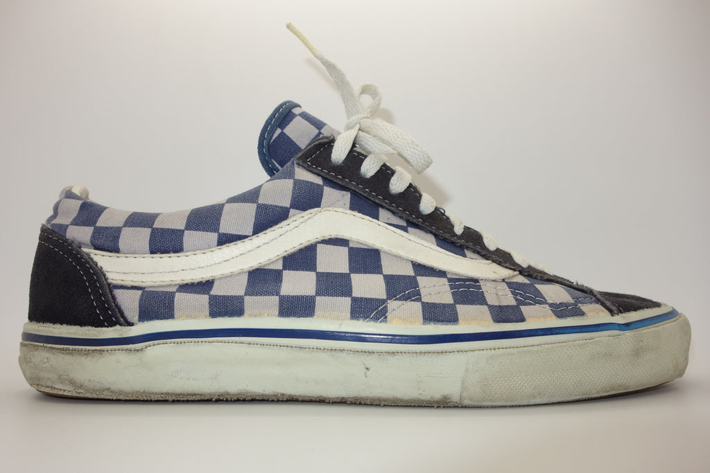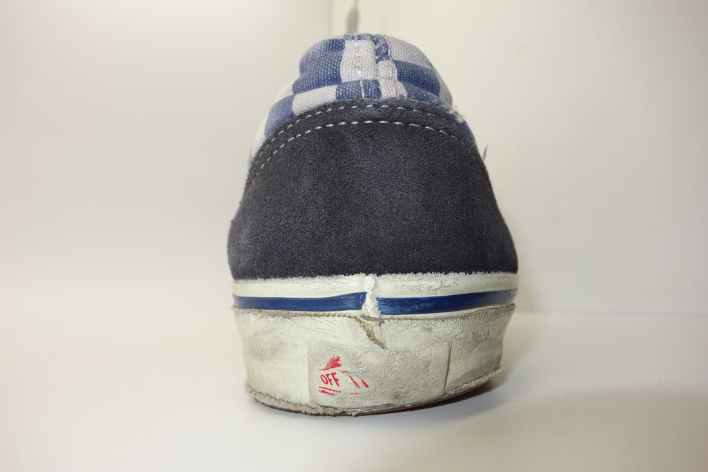 good used condition & all rubber remains soft & flexible despite some dryness & minor stress cracking from crush injury. some colour bleed from blue checks into whites. internal heel shows wear to lining however plastic counter remains intact.