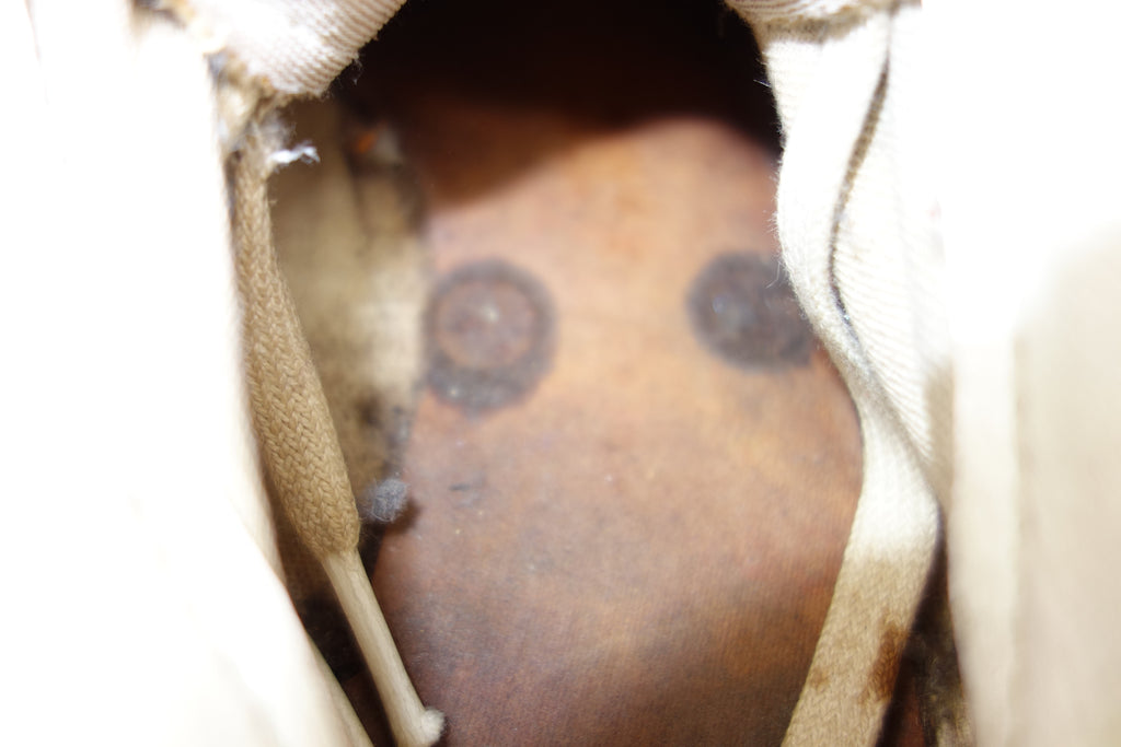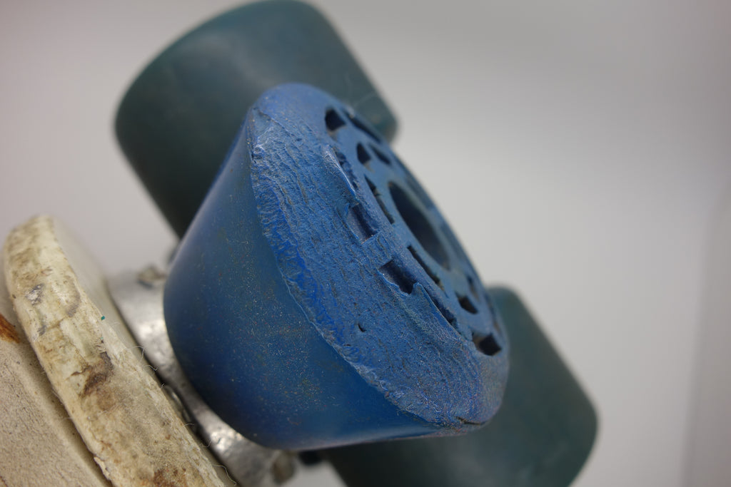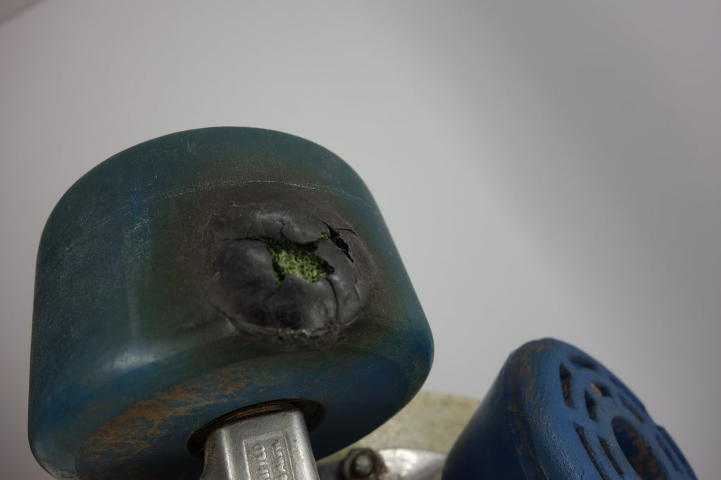 very good used condition. skates are fully functional. 1 air bubble blow out to front left wheel left skate but wont effect roll. some wear to stoppers & residue build-up on washers. minimal heel lift from the foam midsole & the logo tag are missing from the tongue, now empty of foam. will require insole replacement upon exposed board footbed & rivets.