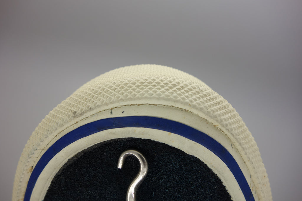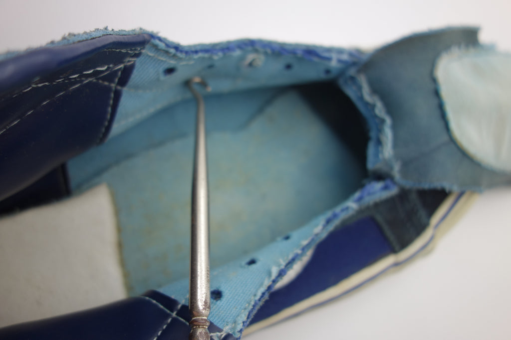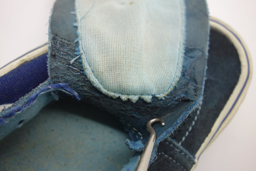 near flawless! all rubber remains soft & flexible. 1 area of stress cracking only at the toe from crush injury. laces are not original & the interior is blue! there are early examples of blue insoles however the inner lining is also blue. this leads me to believe the uppers were dyed however not when the shoes were intact because the leather jazz for example does not show any blue. the suede has stiffened slightly but still butter! the 2-piece tongue stitch has weakened however will not effect wear. both shoes list US12 however fit ever so slightly bigger, towards but not quite at the elusive US12.5.
