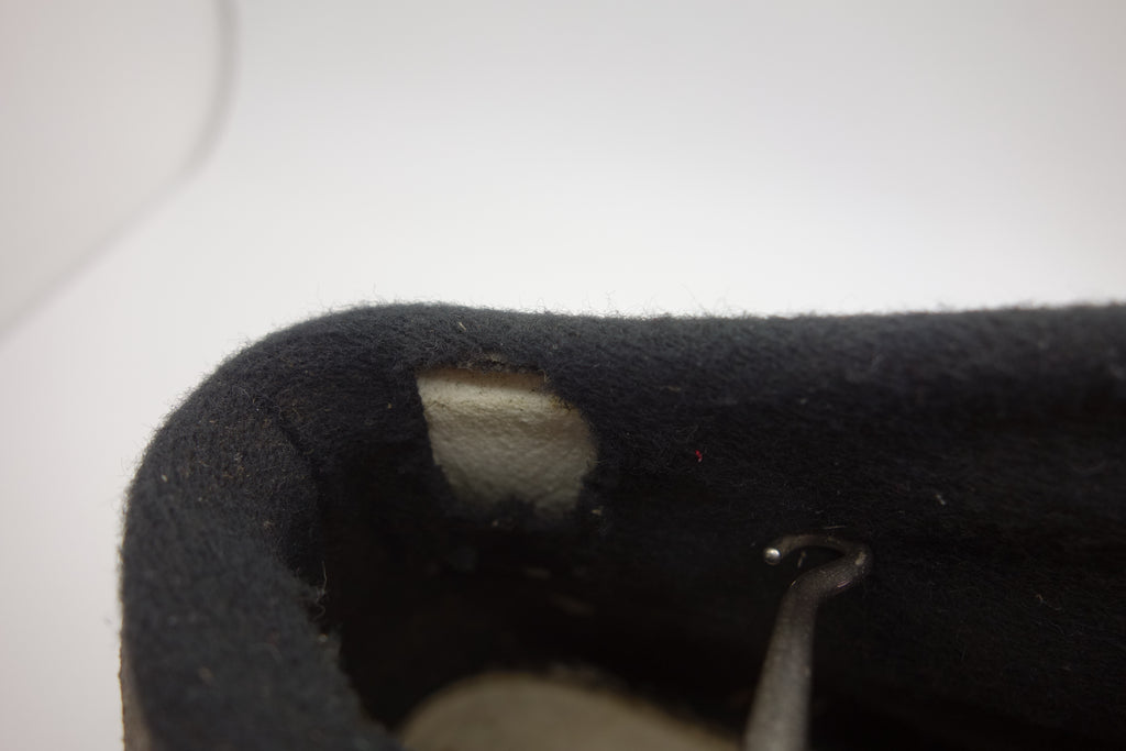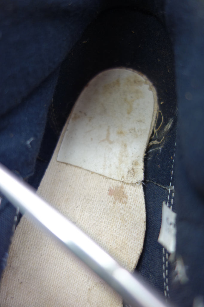 unworn however were exposed short term to display elements with resulting faded uppers. the overglue adhesive has discoloured & may cause separation however all rubber remains soft & flexible. from experience will hold up to normal wear. foam fiber-fill tongue has perished & will leave dry black residue on socks & insole. laces not original. 1 hole in tricot lining exposes styrofoam padding