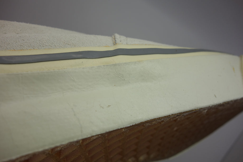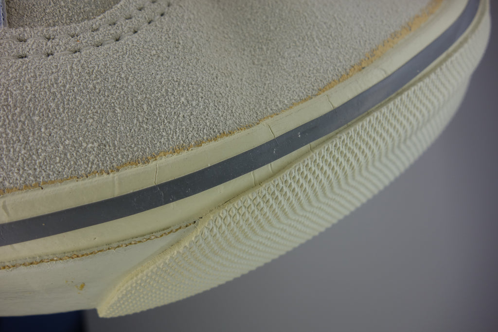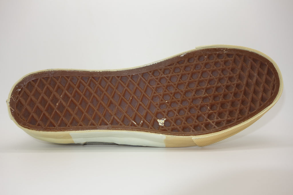 the US7.5 is pictured in full & is unworn however quite obviously saw long-term exposure to light as a window display floor model. price stickers on the foxing reveal the original colour, whereby some adhesive paper does remain. the suede remains soft however some blemish prsent from storage/handling wear. the rubber remains soft & flexible despite widespread yellowing, jigsaw cracking & wrinkling upon bend. from experience however van's of this age tend to hold up normal despite such defects. the left waffle especially has darkened but remains soft & should hold up to normal wear. some curling to vinyl heel inserts. wear at own risk.