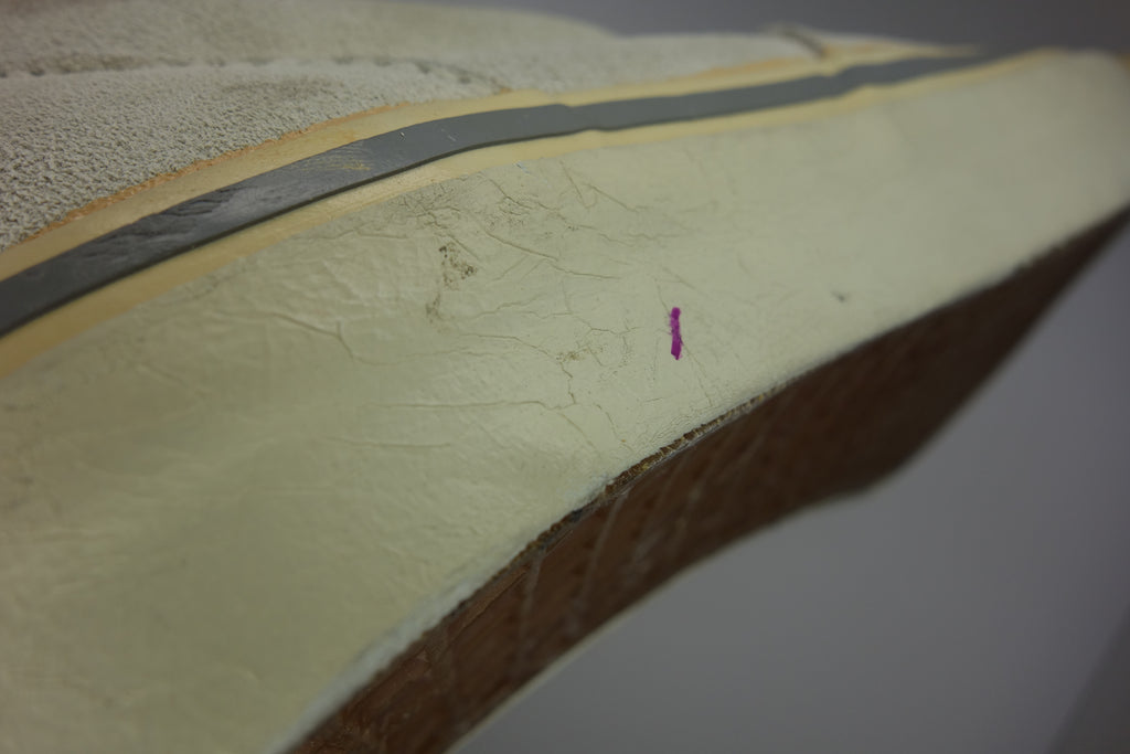 the US7 is less effected by the elements & the left shoe is near mint. the right saw short-term use as display model with resulting lateral rubber yellowing & light dusting to the suede. the rubber is dry rather than hard & despite wrinkles upon bend will hold up to normal wear.