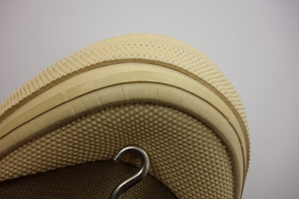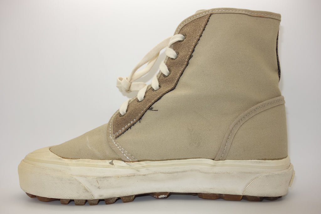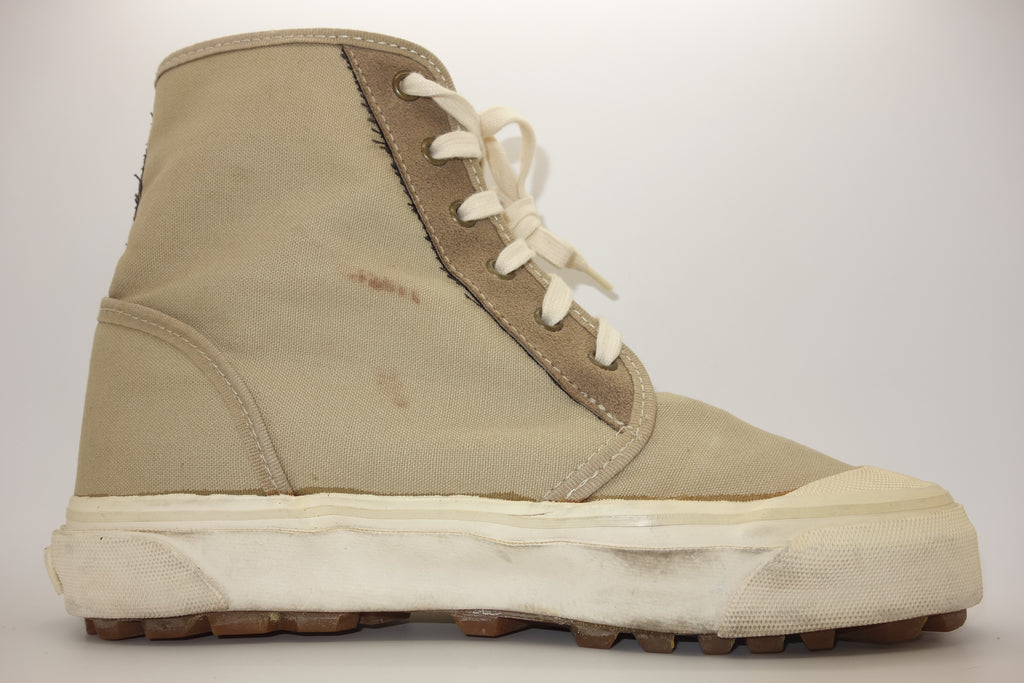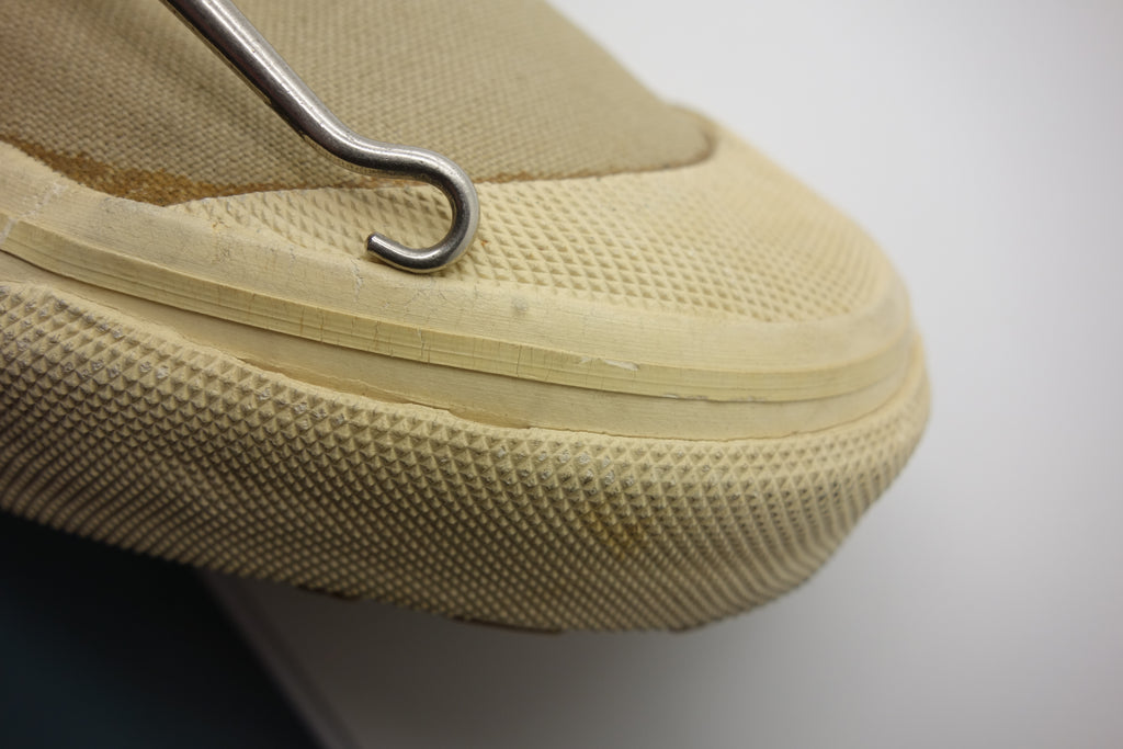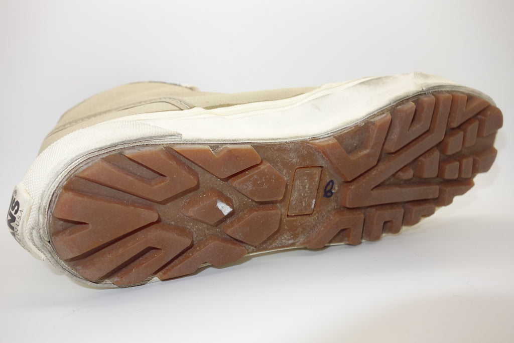 good used condition. these saw usage as floor display model with resulting rubber yellowing to left medial side & toes. the rubber remains malleable however hardened in areas including the foxing stripe. from experience these should hold up to normal wear with minimal rubber loss. i forsee rubber flaking rather than cracking & only toe creases presenting problems. the foam fiber-fill tongue has persished & the minimal padding in the tongue may leave dry black residue on insole & socks.
