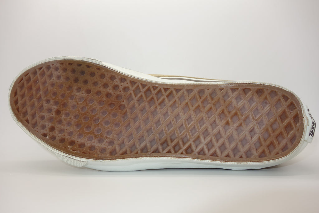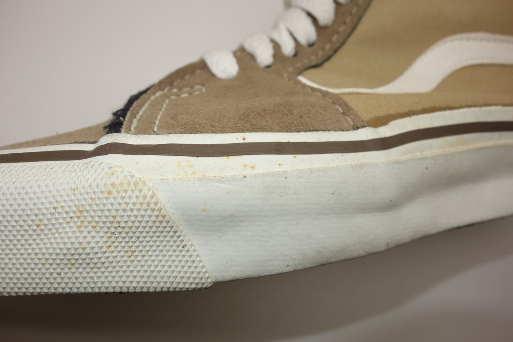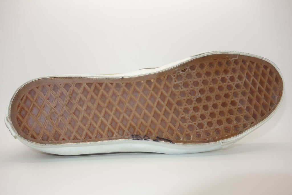 new old stock. all rubber remains soft & flexible apart from the foxing stripe at the toe area. all white rubber is unaffected. from experience these will hold up to normal wear with possible flaking of the stripe only at the front. despite the waffles measuring different im confident they fit the same & based on the 2nd last pic the angle of the right heel friction explains it. very minor age spotting to rubber sidewall