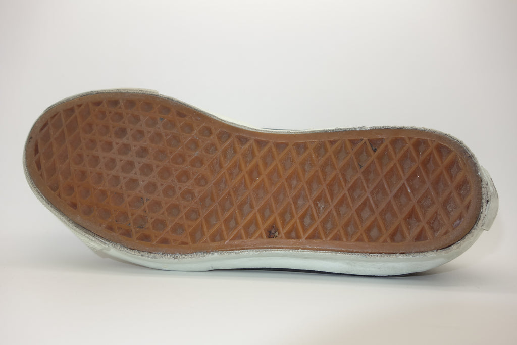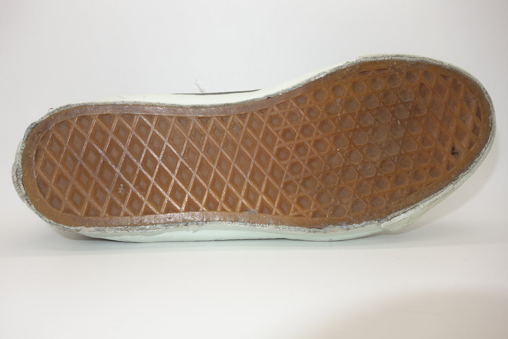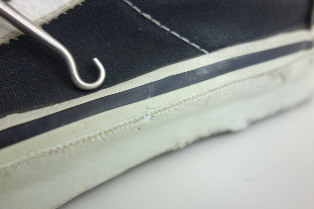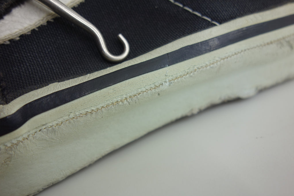 excellent used condition. these were diy customised between the 2nd & 3rd stitch of the high top & i cleaned it up down to the 1st stitch! the seal is tight & the canvas should not fray markedly. the white rubber is more dry than it is hard, shows stress cracking & may crack upon bends. regardless will hold up to normal wear.
