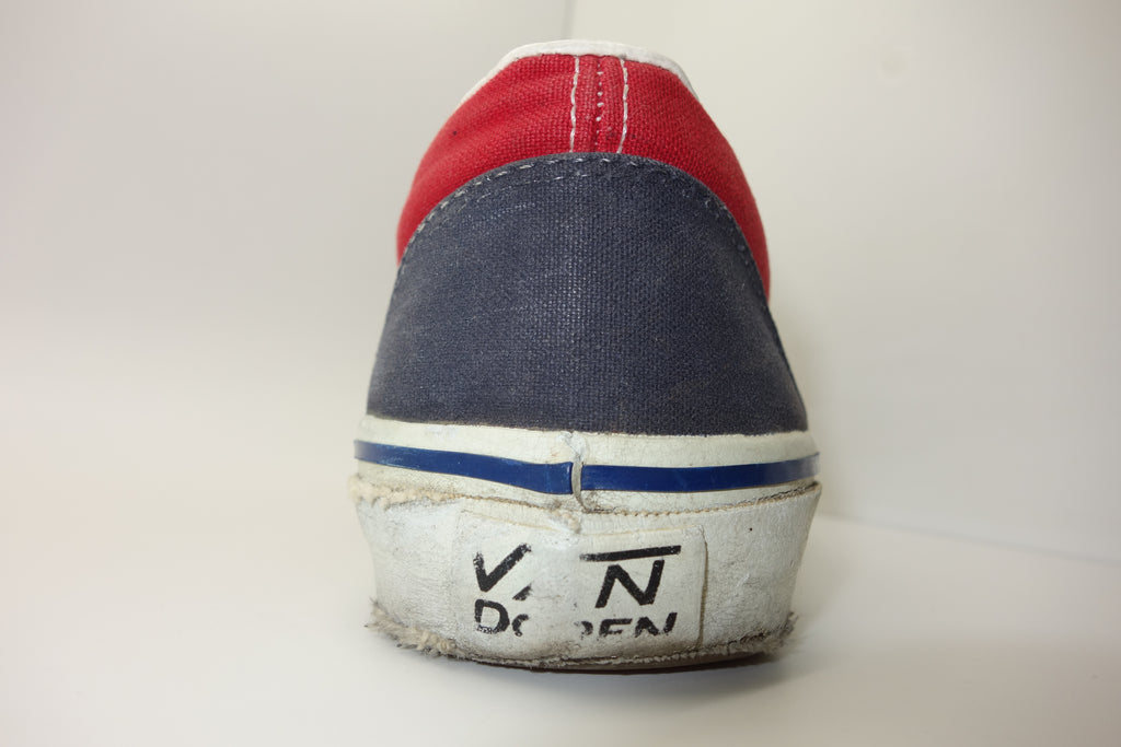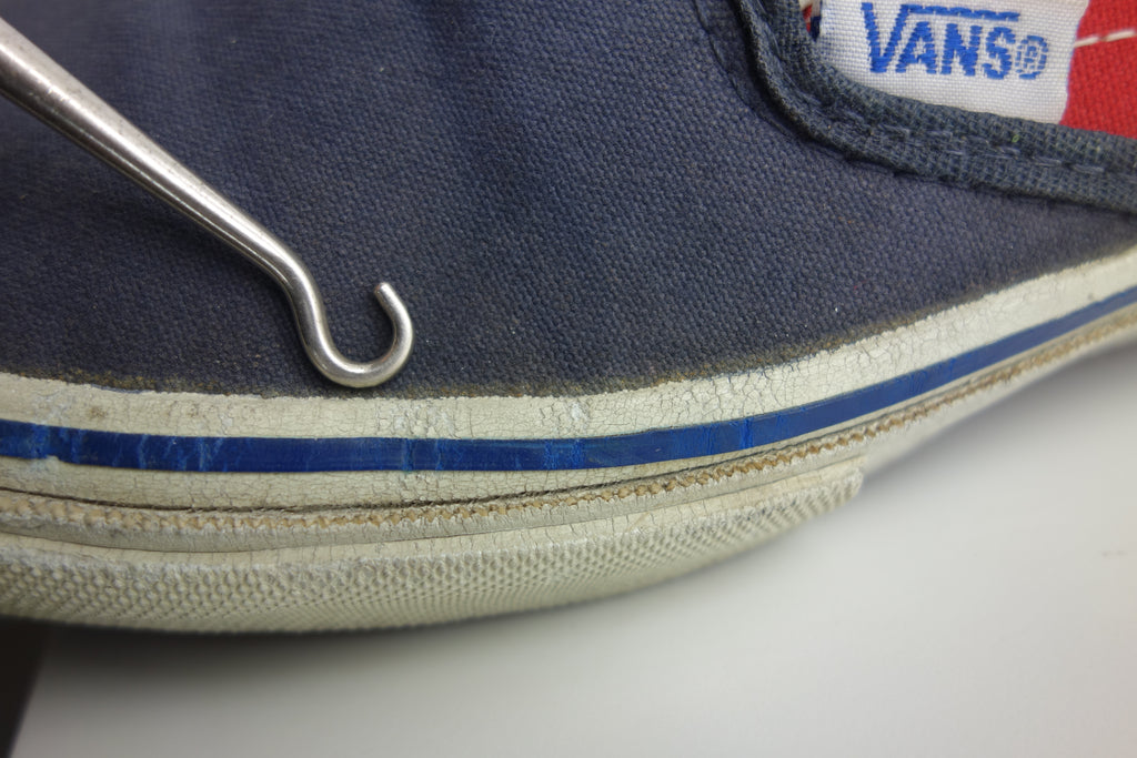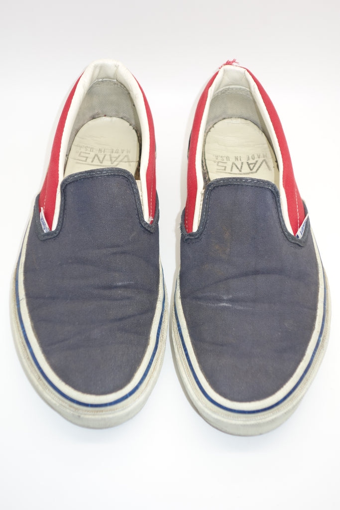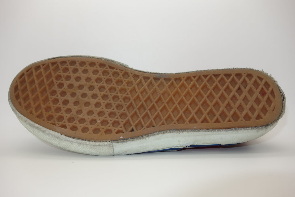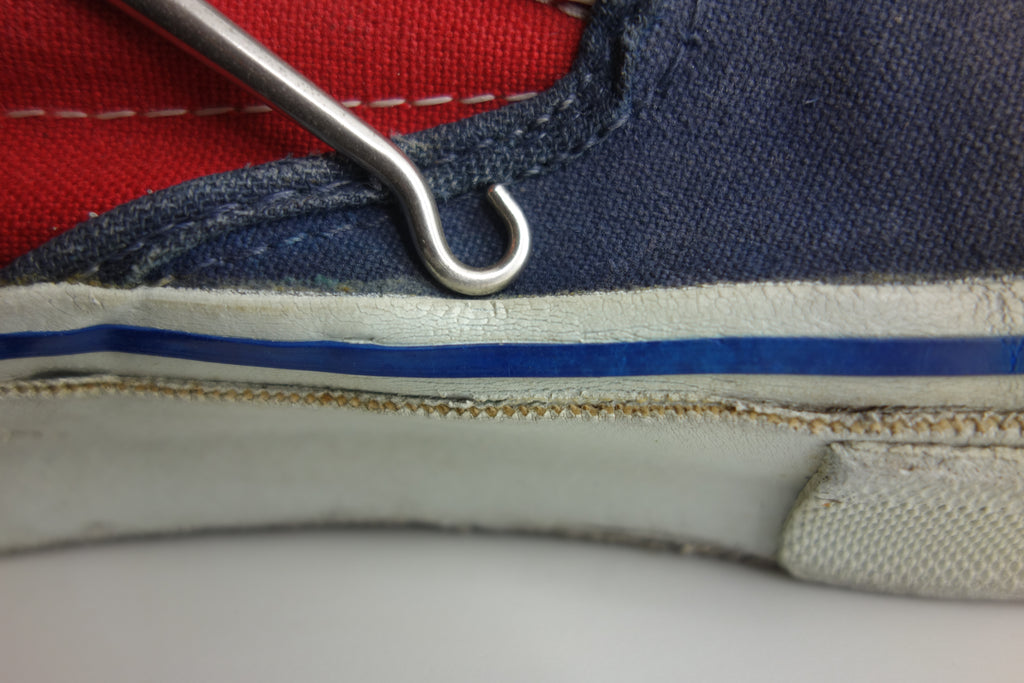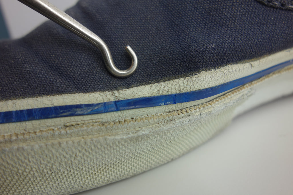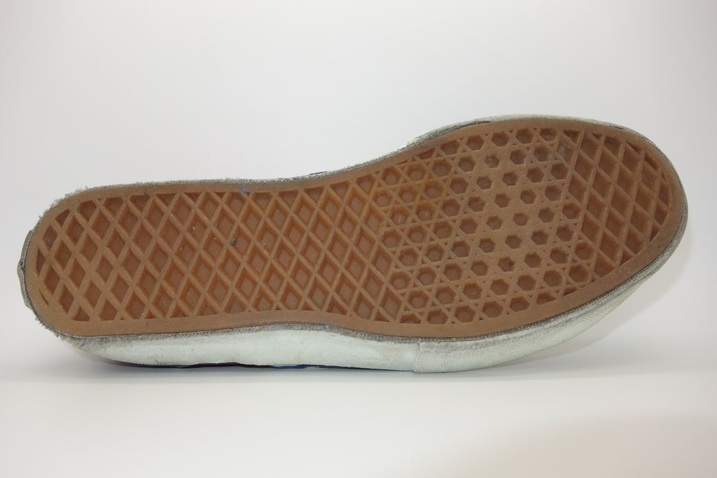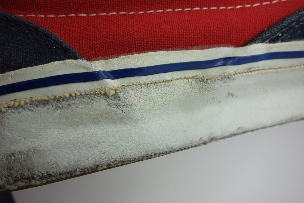 good used condition. all rubber remains soft & flexible albeit dry & crusty. widespread micro stress cracking resulting from dryness however very little separation with uppers, & these will NOT crack. the blue canvas was faded & then DIY dyed with navy blue canvas dye. the execution was superb & the only negative is slight stiffening of said canvas.