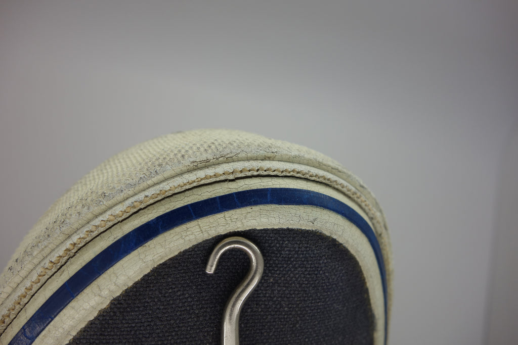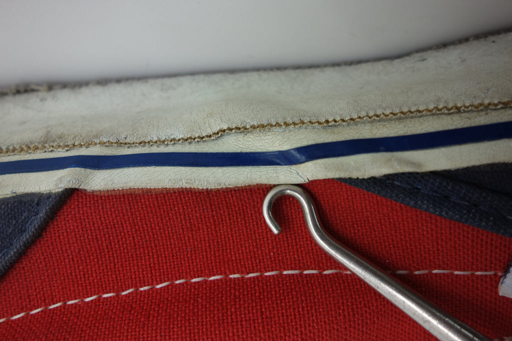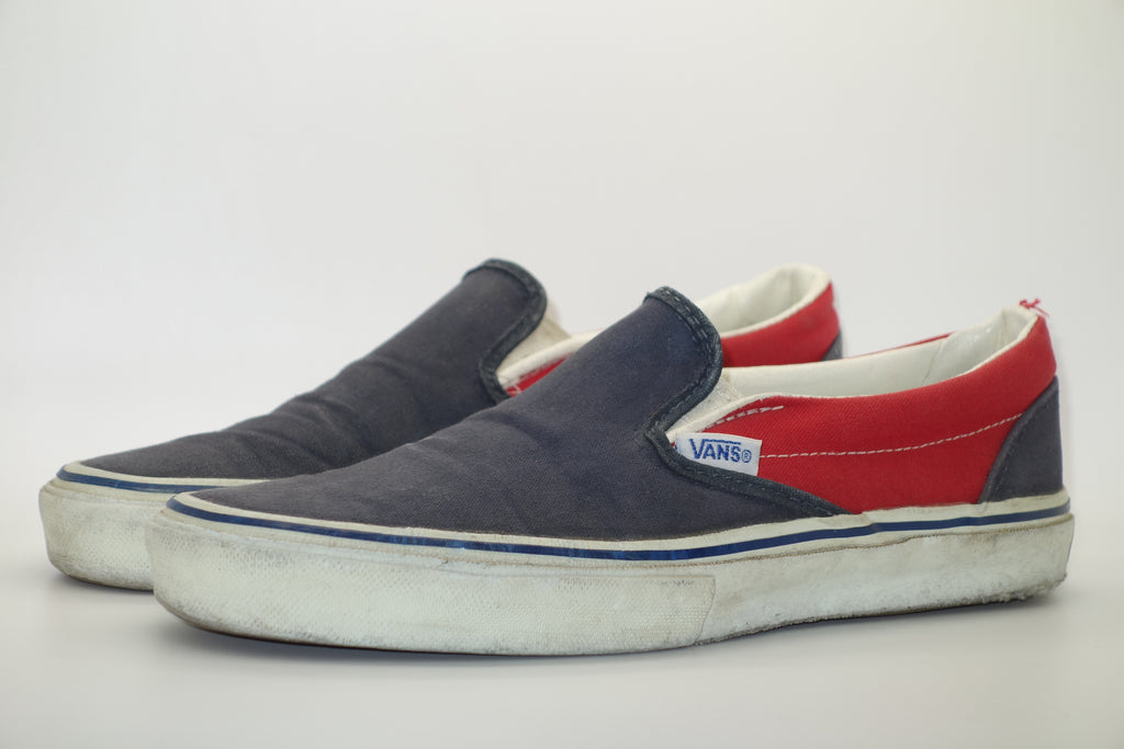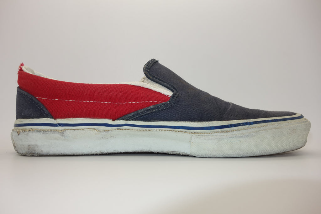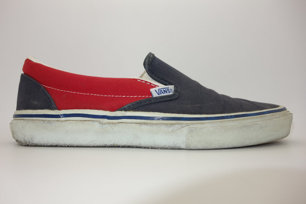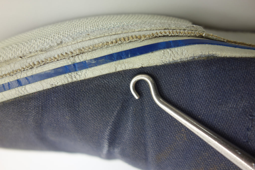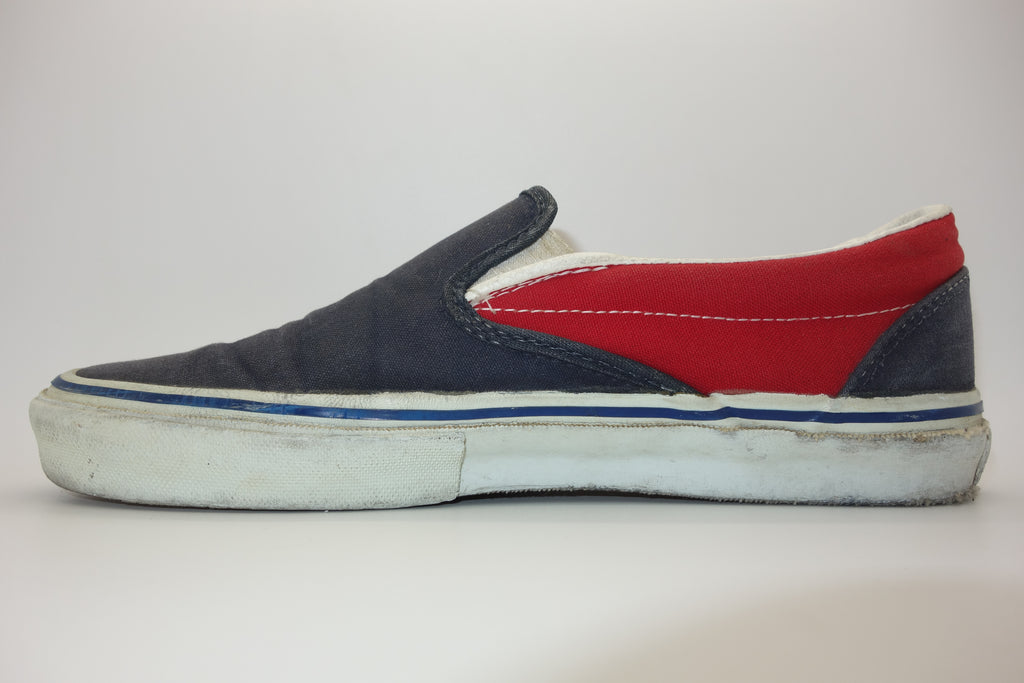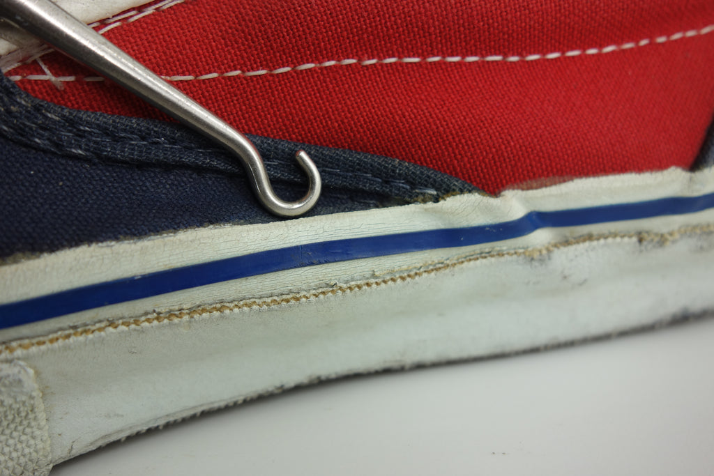 good used condition. all rubber remains soft & flexible albeit dry & crusty. widespread micro stress cracking resulting from dryness however very little separation with uppers, & these will NOT crack. the blue canvas was faded & then DIY dyed with navy blue canvas dye. the execution was superb & the only negative is slight stiffening of said canvas.